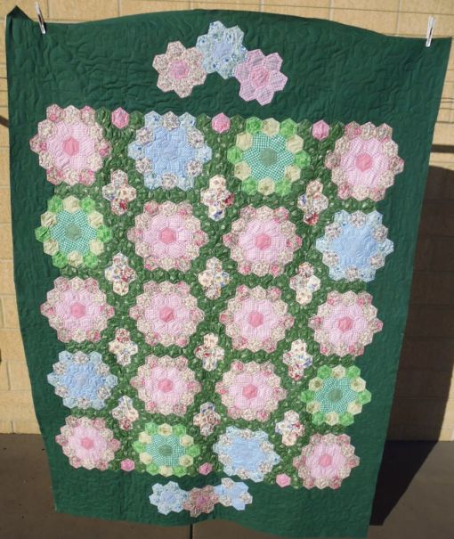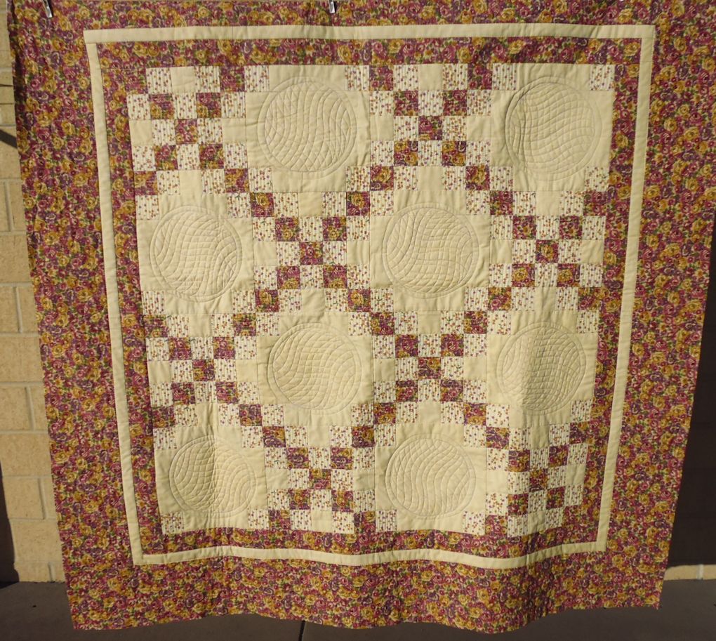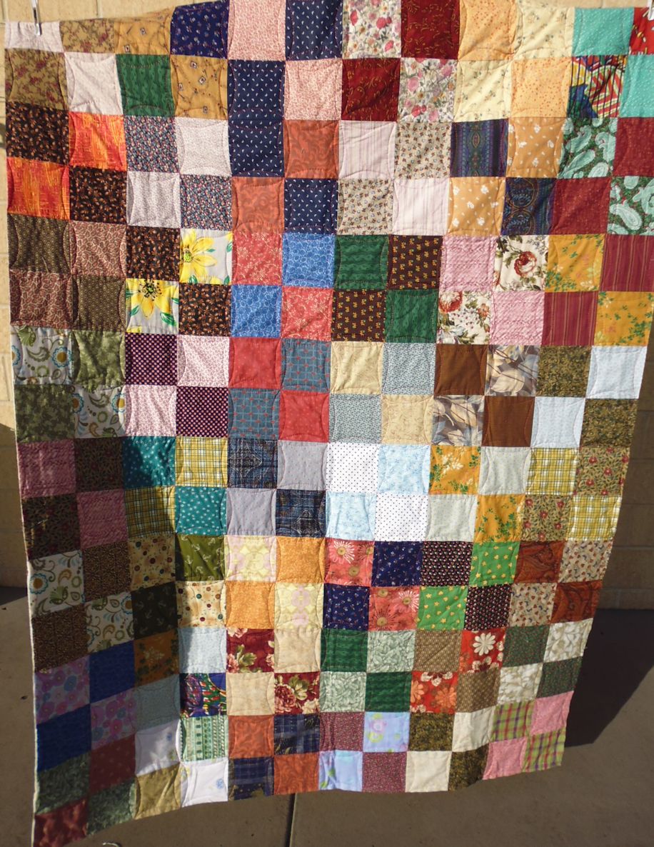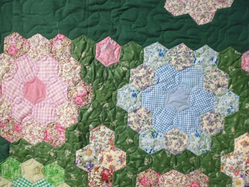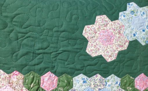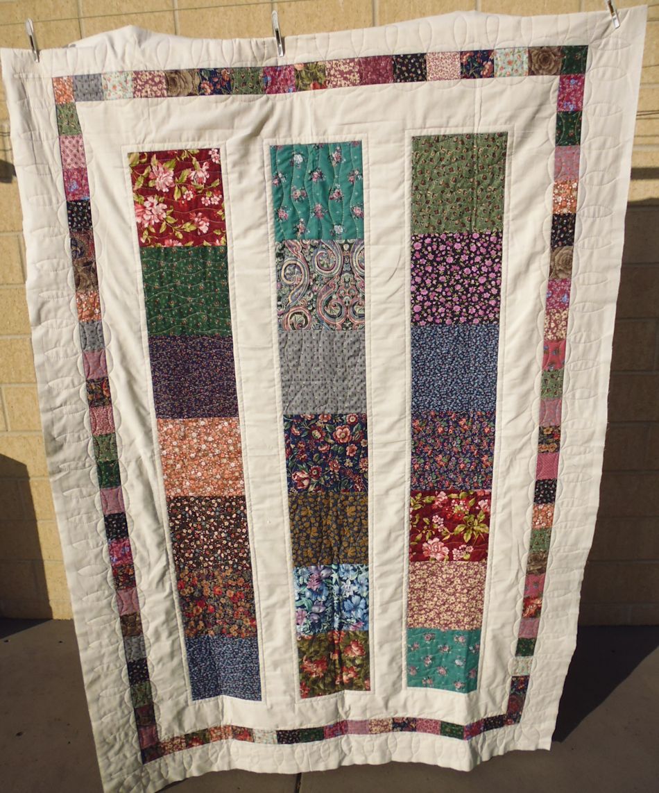 How to quilt this very geometric and colourful scrappy quilt? I thought about straight line ‘modern’ quilting, then decided to do a variation of ‘graffiti’ quilting. I started in the centre with large overlapping spirals, then a whole slew of flame-style stitching, finishing at the outer edges with a open headband motif. I used a variegated thread in blues, greens, yellows, and purples to match the vibrant colours of the squares.