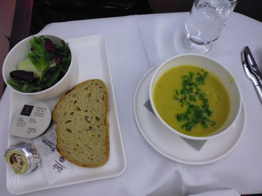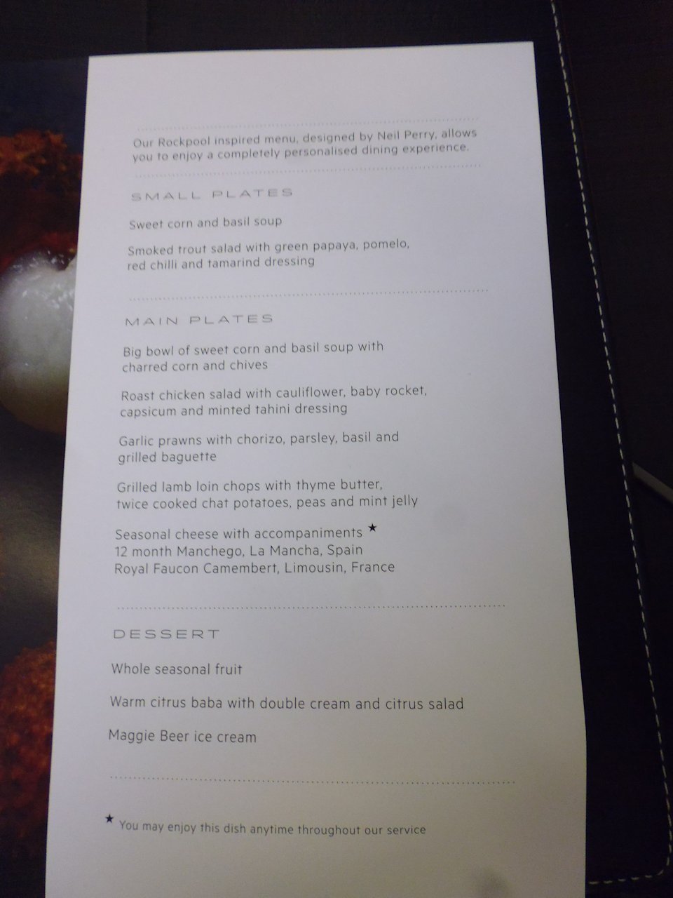 On this afternoon flight, we were fed dinner — see the menu for the food options. I had the soup (with sourdough bread), the lamb chops (two of them!) and the citrus baba.