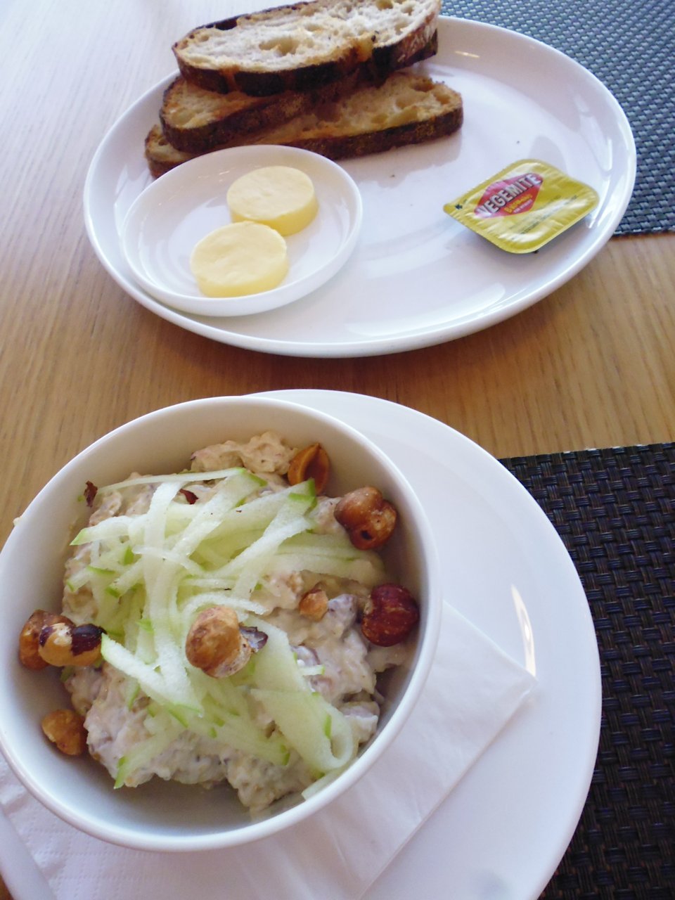After staying overnight in Sydney, I forgo the breakfast at the hotel, instead choosing to eat at the Qantas lounge. My choices from that menu — eggs benedict with smoked salmon, bircher muesli with hazelnuts (?) and apple, an apple julep (delicious! [non-alcoholic]), and sourdough toast with Vegemite. All very yummy!