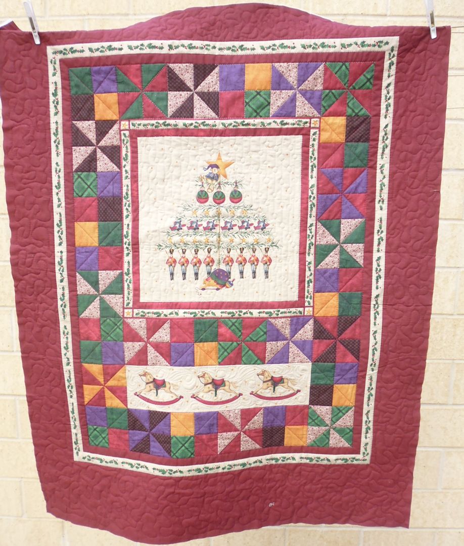 This next quilt was a Christmas panel. How to quilt it? I started by stitching in the ditch around all the elements of the panel, did cross-hatching on the diagonal in all the ‘border’ blocks, with some MacTavishing surrounding the rocking horses, and some stitching resembling Christmas baubles in the background to the tree, finishing up with a meandering stipple in the outer border.