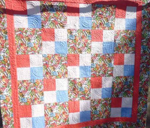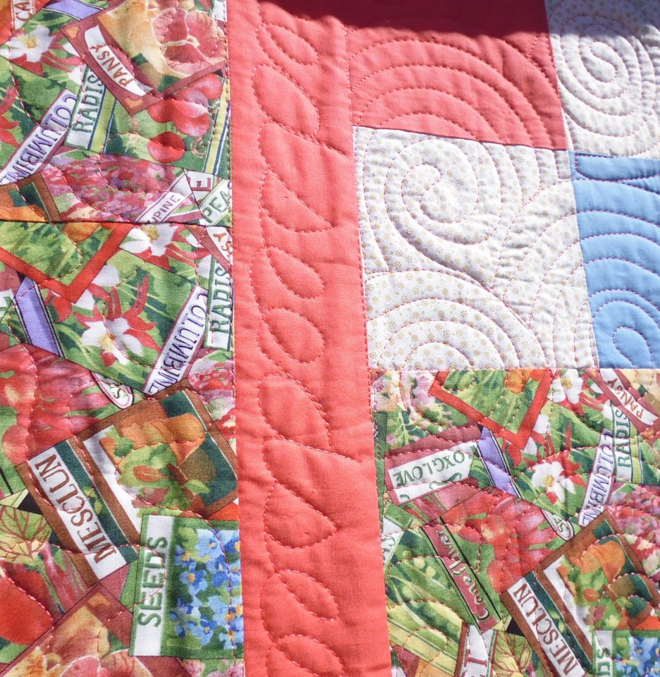 A big quilt — with seed packets as the fabric theme! After stitching in the ditch around the blocks, I stitched a large meander in the main border. In the small border, I continuously stitched the word ‘seed’. Finally, I stitched a spiral motif in the main quilt top, using a matching pink/watermelon coloured thread.
