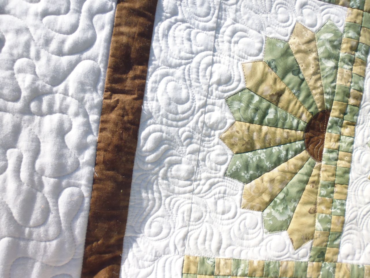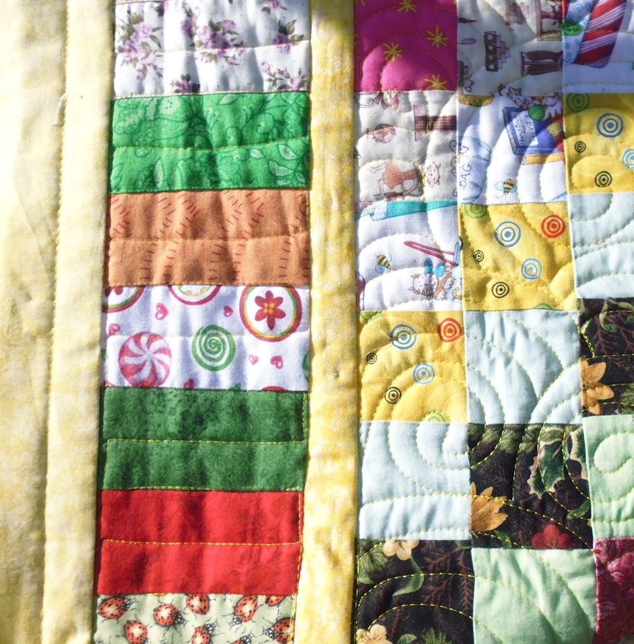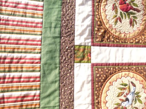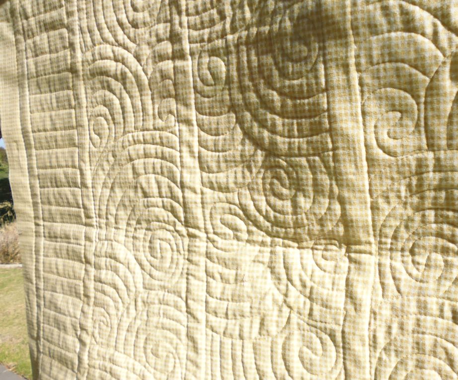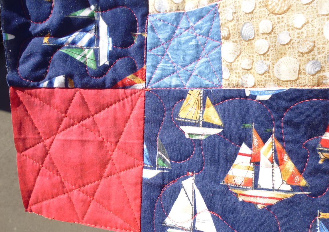 How to quilt this quilt? As usual, I started by stitching the ditch around all the main blocks and elements. For the border, I did a large meandering stipple, with stars in the corner squares. In the main top, the busy fabrics leant themselves to a simple motif — I chose my ‘go to’Β open headband motif, using red thread.