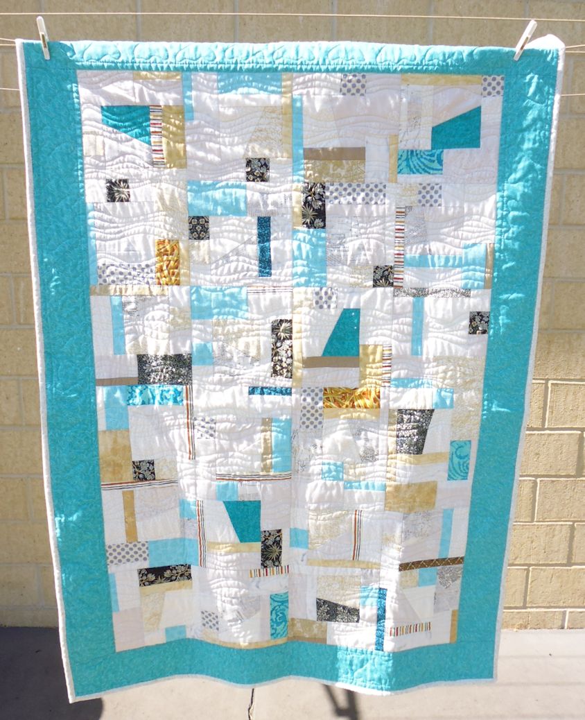 I used a pattern from Four Paws Quilting, called ‘Not So Crazy‘, to make this quilt from a heap of beige scrap fabrics. I added some aqua scrap fabrics as well, and some brownish ones. As I was putting it together, I realised that the colours reminded me of the beaches near where I live — white/beige sand, aqua water, brown seaweed washed up on shore, colourful umbrellas (the stripe fabric), swimsuits (dotted fabric), and eating fish and chips at the beach (the chips/fries fabric and the newspaper fabric). The name ‘Crazy Beach’ comes from that, plus a play on words…