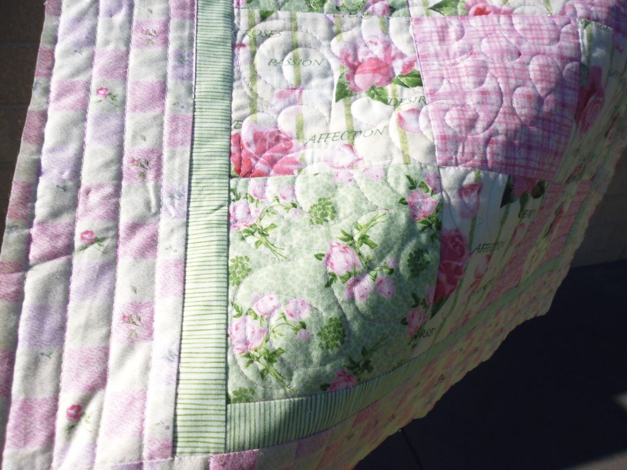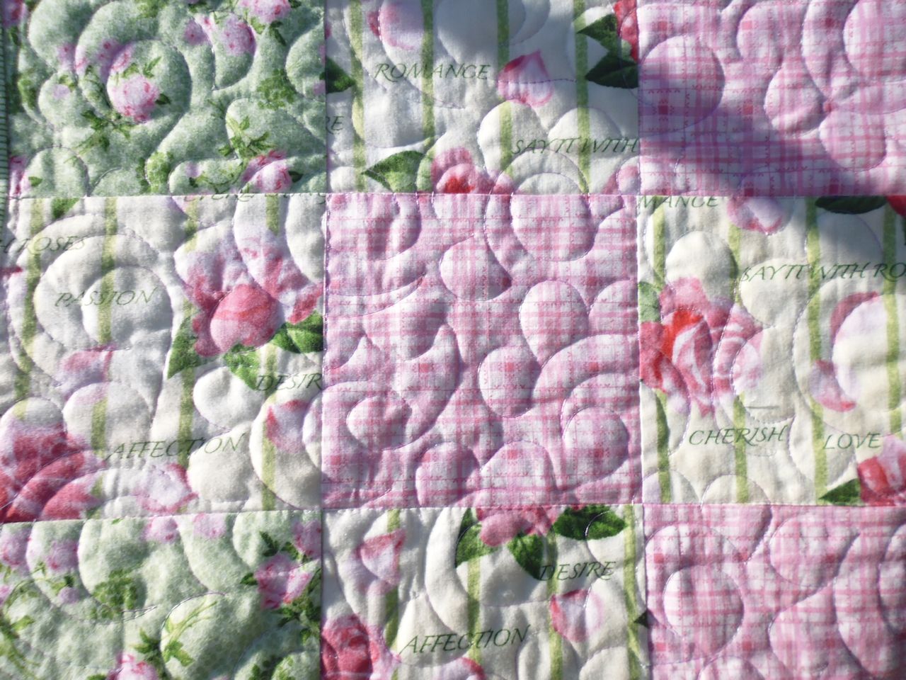 This was a pretty pink and green quilt. I started by stitching in the ditch around the main blocks and borders, then did straight lines in the border, following (approximately) the lines formed by the squares in the fabric’s pattern. I quilted the main part of the quilt top with a flower variation on the open headband motif — instead of an arc for the final layer, I stitched half shells, emulating flower petals.