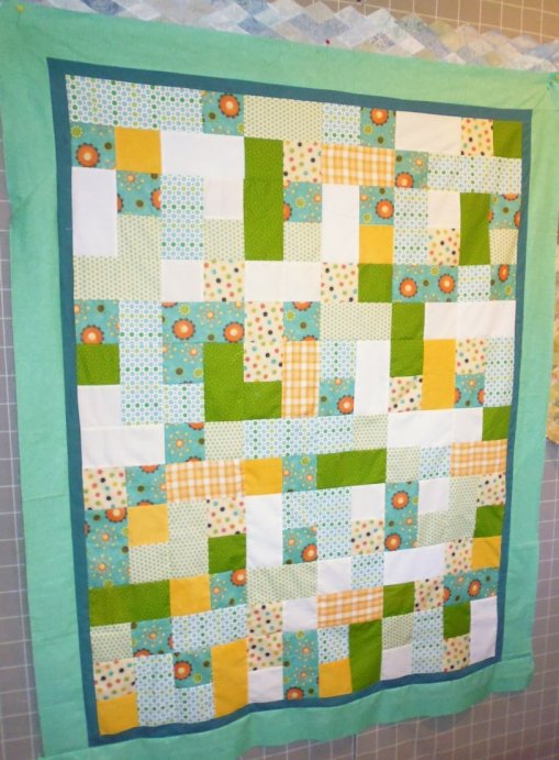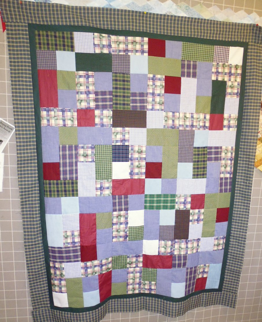 For the other three, I used fabrics from the Community Quilt (CQ) fabric stash that my friend who hosts us has in her house. The CQ people are always wanting quilts suitable for males (i.e. not pink and floral!), so I raided her fairly large stash of plaids and darker-toned fabrics to make two of the tops. For the third, I found some bright yellows, greens, and blues, and made the final top (Update: I got to quilt this one too!). All have now been donated to the CQ program for finishing off and delivering to charitable causes.