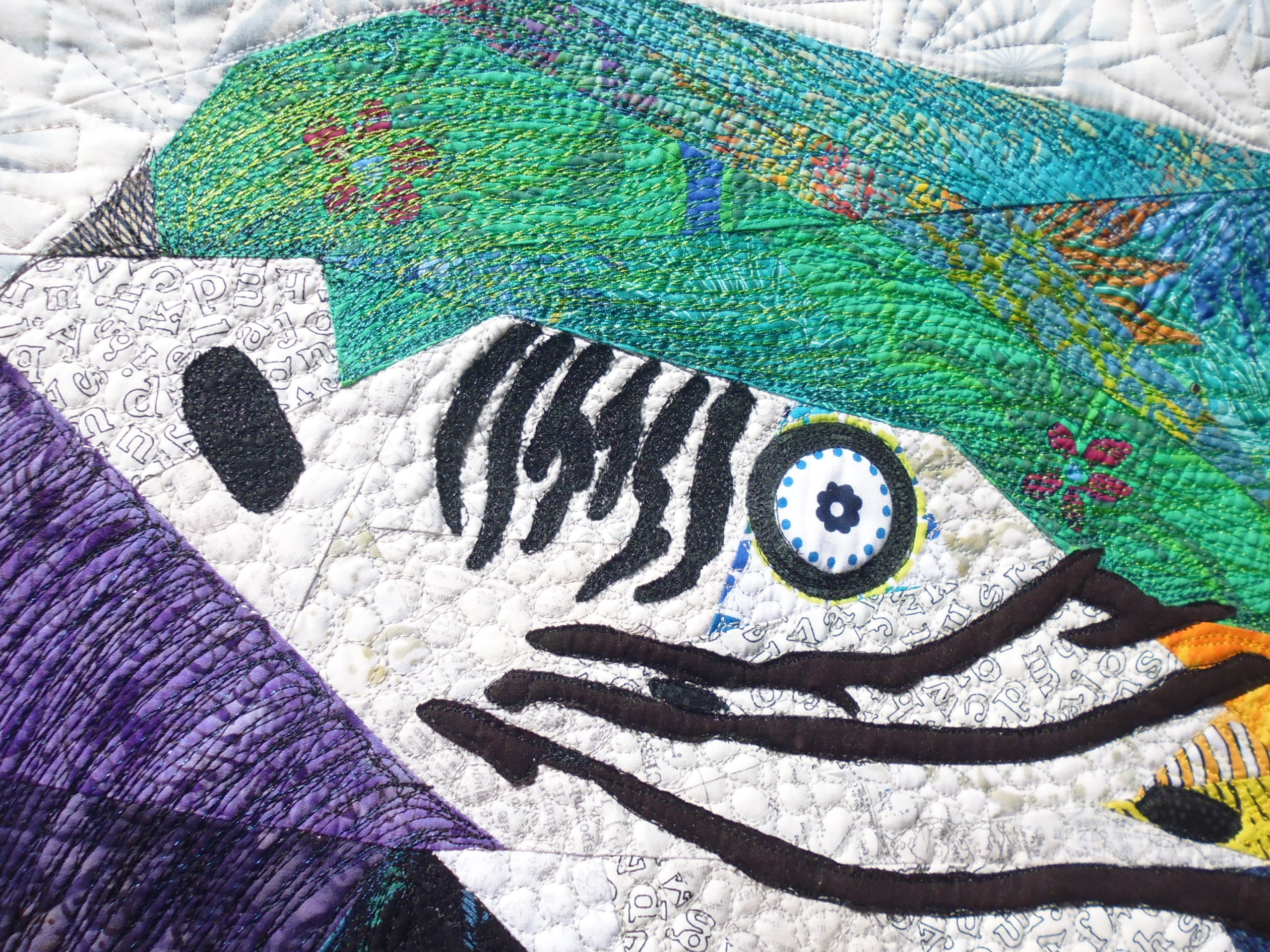 I finally finished the macaw art quilt I started last year. Actually, I finished it late last year, but since then I’ve entered it in an art competition (textile category) where a condition of entry was that it had to be for sale. That competition is over now, so now I can put up the pictures of it.