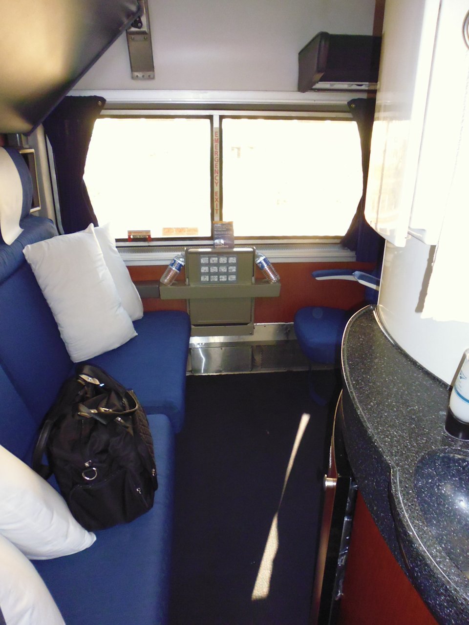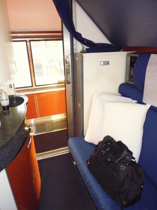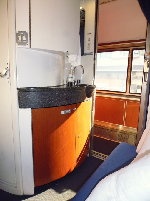 Other hints: Take ear plugs for sleeping, and possibly a sleep-inducing drug if you have trouble sleeping on things in motion, such as planes. You can bring your own snacks and drinks, but be discreet and consume them in your own room, not in the public areas (there’s a snack bar that sells food, drinks, and alcohol, but they may not have the brands you want). Don’t bring in marijuana from Colorado! 🙂 Bring your own toiletries. The car attendant just showed me the storage area in my room near the hand basin where there were toiletries, wash cloths, tissues, and spare toilet paper!