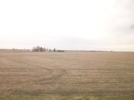 - It’s very cloudy today — that overall grey nothingness that casts a dull pall over everything and just absorbs any light. As expected, the landscape is gently undulating farmland, with silos (grain?, corn? soy?), barns, farmhouses, and little towns. The trees appear to be bare — no leaf and flower buds are discernible yet from a passing train, though you can see birds’ nests. There are some patches of green grass, but mostly the fields are bare soil, waiting for the spring burst of life for the crops. Some fields have cattle in them. The predominant colours? Grey, brown, and yellow, with small patches of green.