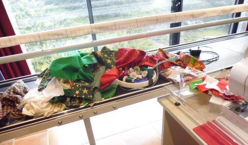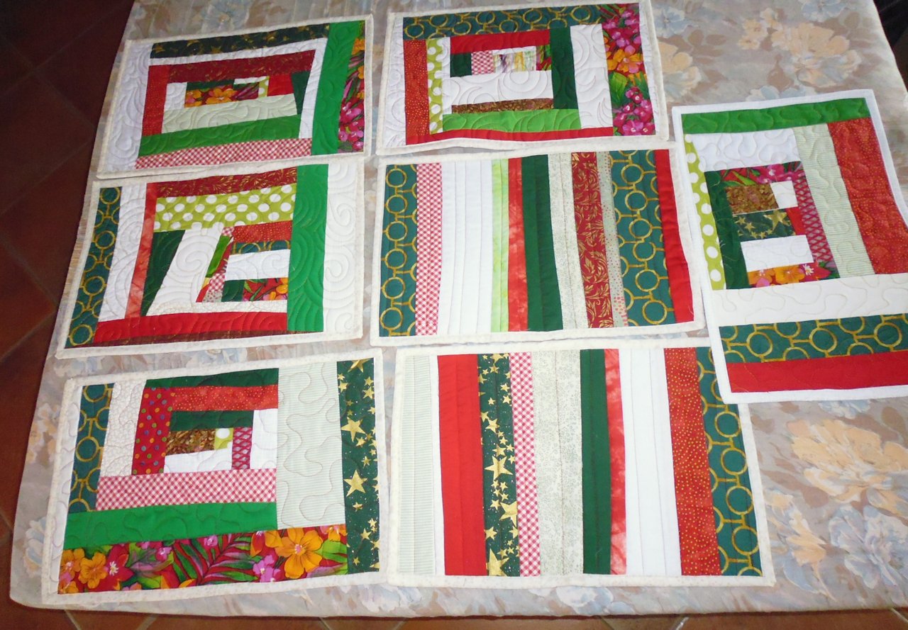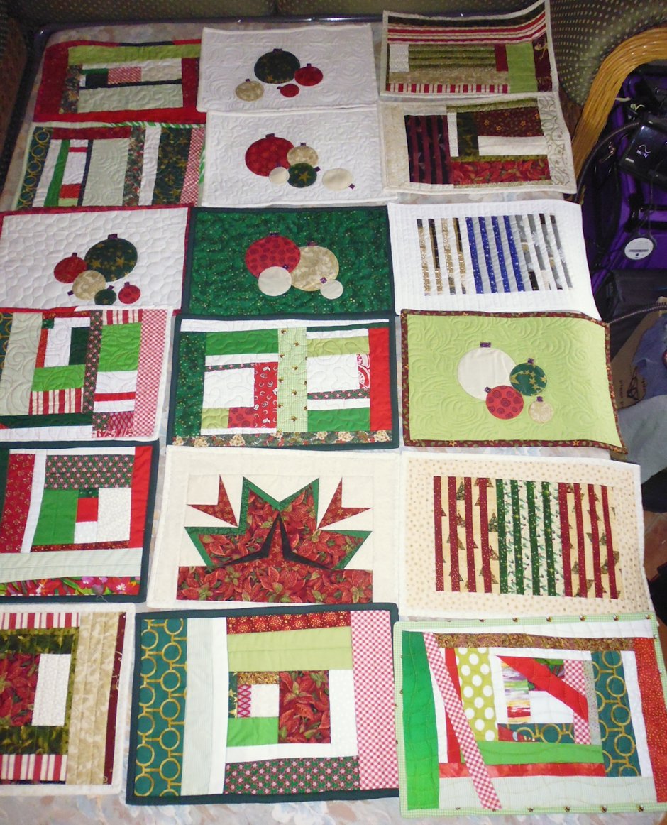 This year, I decided to do a stash busting exercise—making Xmas placemats for our state guild’s Community Quilts program. These will go to people in retirement villages and nursing homes, possibly hospitals. So I took all my scrap red, green, and white fabrics, matching backings, and batting scraps with me, and sewed up a storm. I ended up making 25 placemats (all 18 x 12 inches). Most were done using improv methods of joining random bits of fabric, and after making the tops, I backed, sandwiched and quilted them, then finished them off with machine-sewn binding.