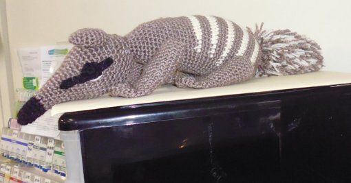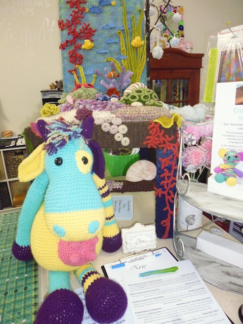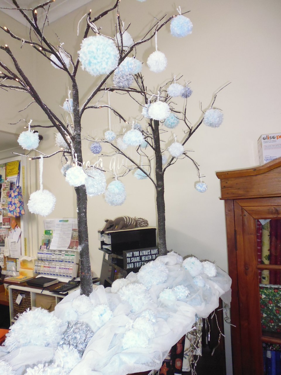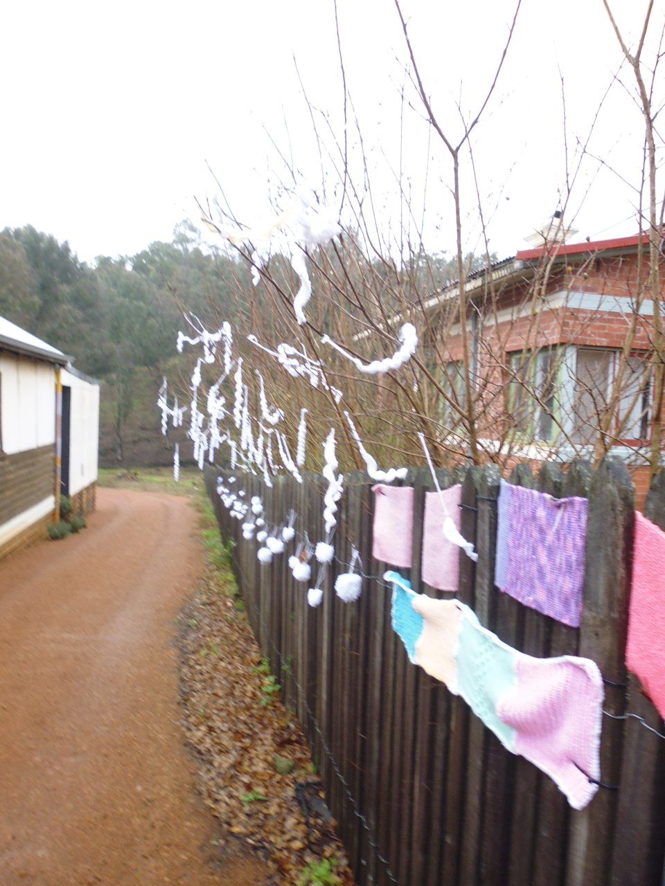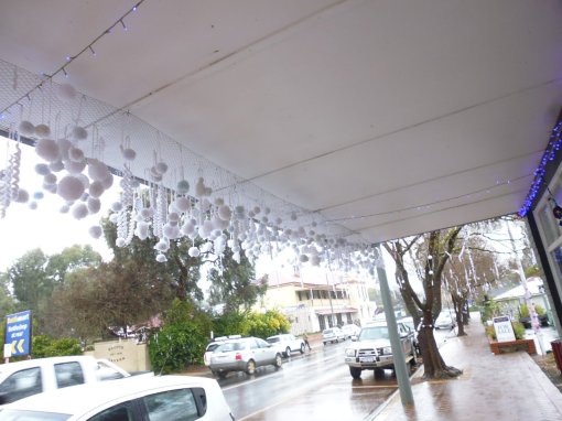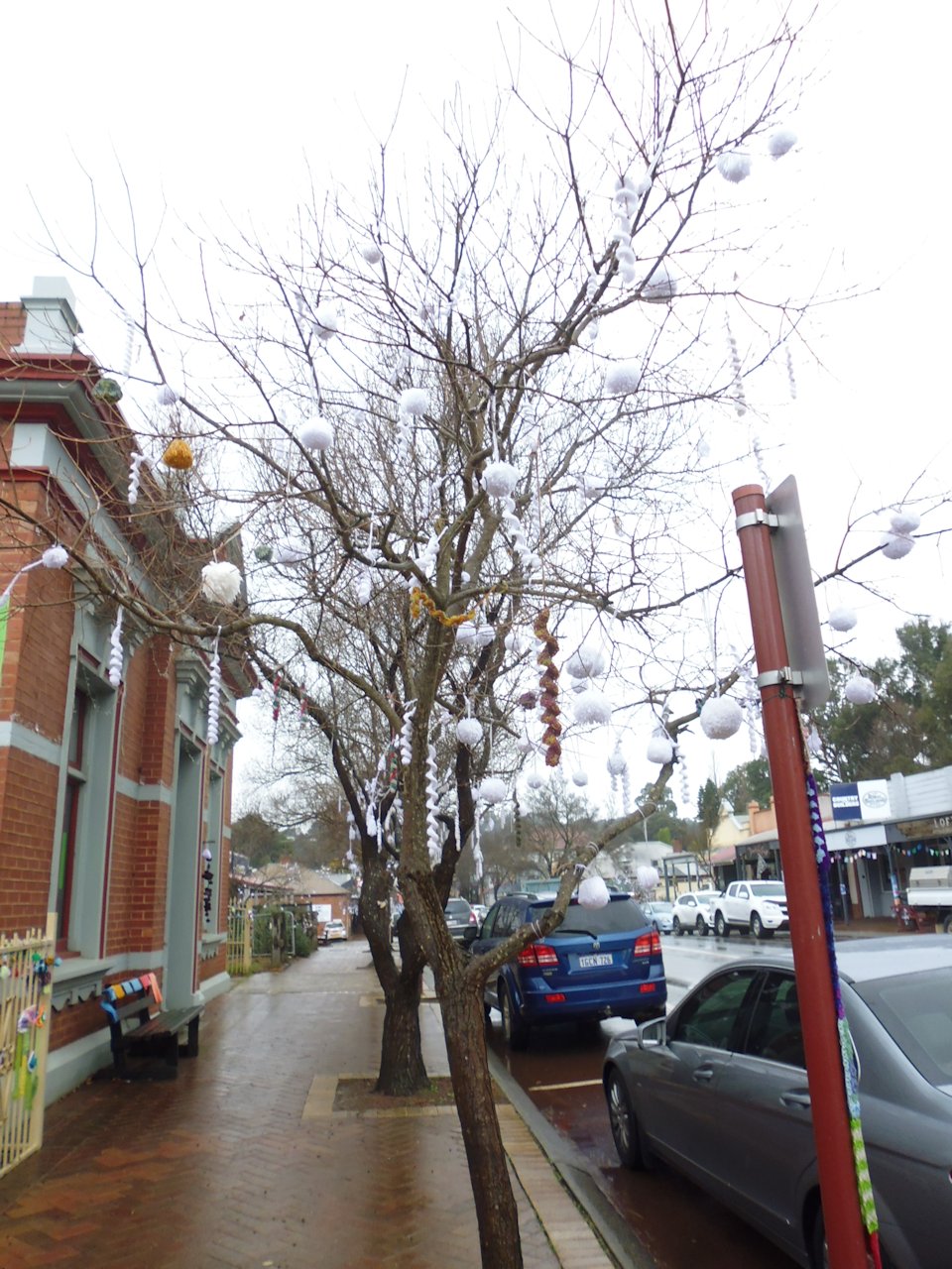 Here they are in various stages of completion (click on a photo to view it larger). Below the photos of the placemats are photos of just a small section of the yarn bombing in Bridgetown’s main street for their annual Winter Festival—this year locals made tens of thousands of yarn decorations (I think it was more than 30,000!) and the yarn bombing was even judged for a Guinness World Record! One of the people who coordinated it was Ann, the owner of Sew Gentle Era, the local quilt and yarn store.