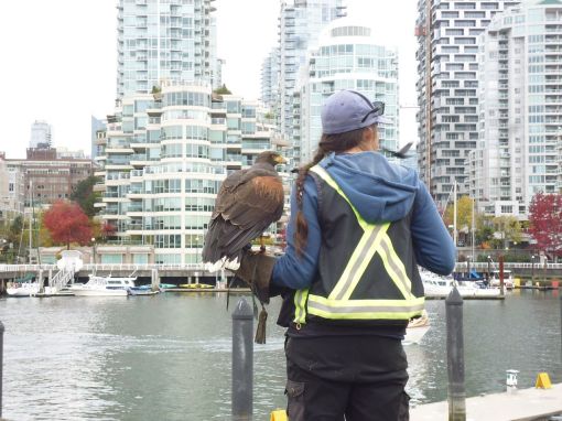 Our hotel couldn’t guarantee all our rooms would be ready until 4pm, so we spent three hours at the Granville Island markets. What a big place, full of arty crafty stores, fruit and vege (and other food) markets, food halls and other eating places. It was too much choice! Eventually I decided to have a smokey beef German/Polish style sausage on a bun with onions and sauerkraut (Kaisereck Deli inside the big Public Market). I took it outside to enjoy the fine weather (cloudy and cool, but no rain). While I was having my lunch I saw a young woman walk past in what appeared to be workclothes for someone working in construction. She had a leather glove in one hand, which looked a bit odd as it had a long part for the lower arm. And then I realised what it was — a falconry glove! She stood near me, put on the glove, and next thing I knew a magnificent bird swooped down and landed on her arm! She gave it a food reward, then sent it on its way again. She moved around the outside area to a couple of different locations, every so often getting the bird to come down from a roof to land on her arm. Very cool!