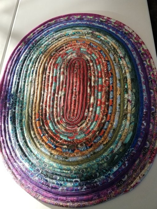 Early in January, I went on a 4-day quilting/sewing retreat with some friends. During that time I made a jelly roll rug (my first ever!), and four quilt tops. The jelly roll colours were much more vibrant than the photo shows. The jelly roll fabric was from the ‘Pastiche’ range by Jason Yenter, In The Beginning Fabrics (http://www.inthebeginningfabrics.com/ and http://www.inthebeginningfabrics.com/shop/c/p/Pastiche-Strip-Rolls-x28221827.htm).