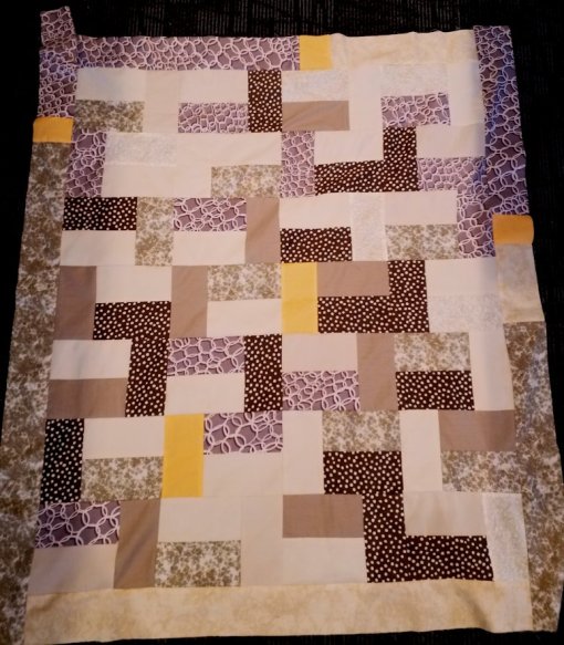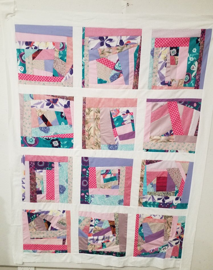 The other (pink one) was a scrappy improv quilt, where I take bits of sort of matching fabric scraps and sew them together, until I end up with other pieces of fabric that I can cut into blocks—in this case, 12.5 inch blocks. Then I added sashing strips and a border. This sort of improv quilt takes much longer than the simple scrappy ones, but it’s a good way to use up smaller scraps.