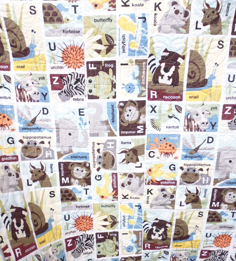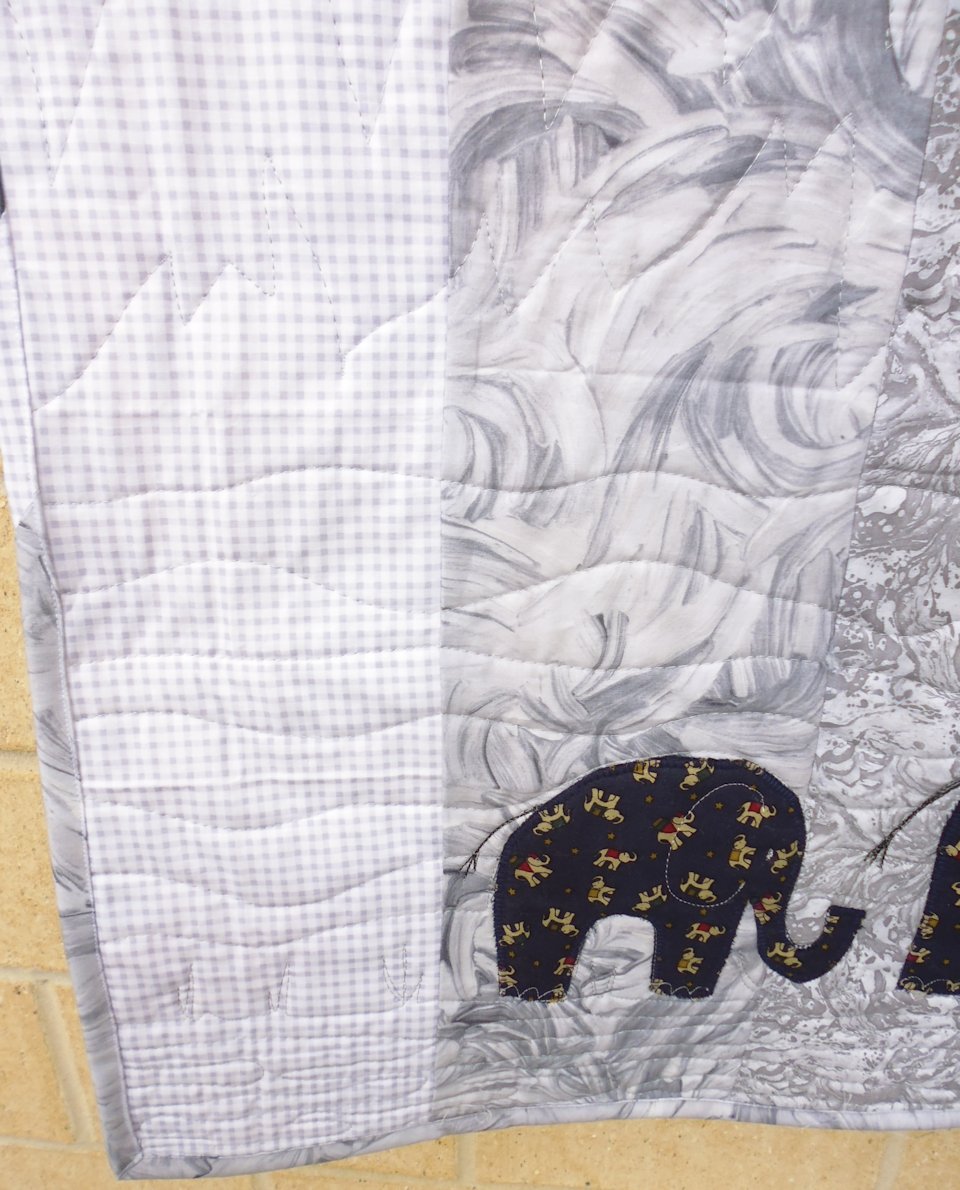 James was born almost a year ago, and was recently adopted by my nephew and his husband. Of course, a new child means a new quilt! When I asked, they said his nursery was in tones of greys and blues, with elephants a big theme. So an elephant quilt it was — I even had some fabric printed with tiny elephants that I used for the appliqued elephants.