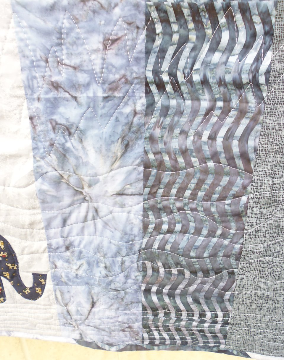 For the quilting, I did narrow wavy lines with grasses popping up every so often to represent the ground below the elephants, followed by wider wavy lines representing heat haze, then spiky lines representing mountains in the distance.