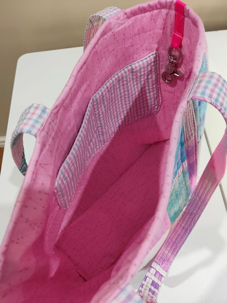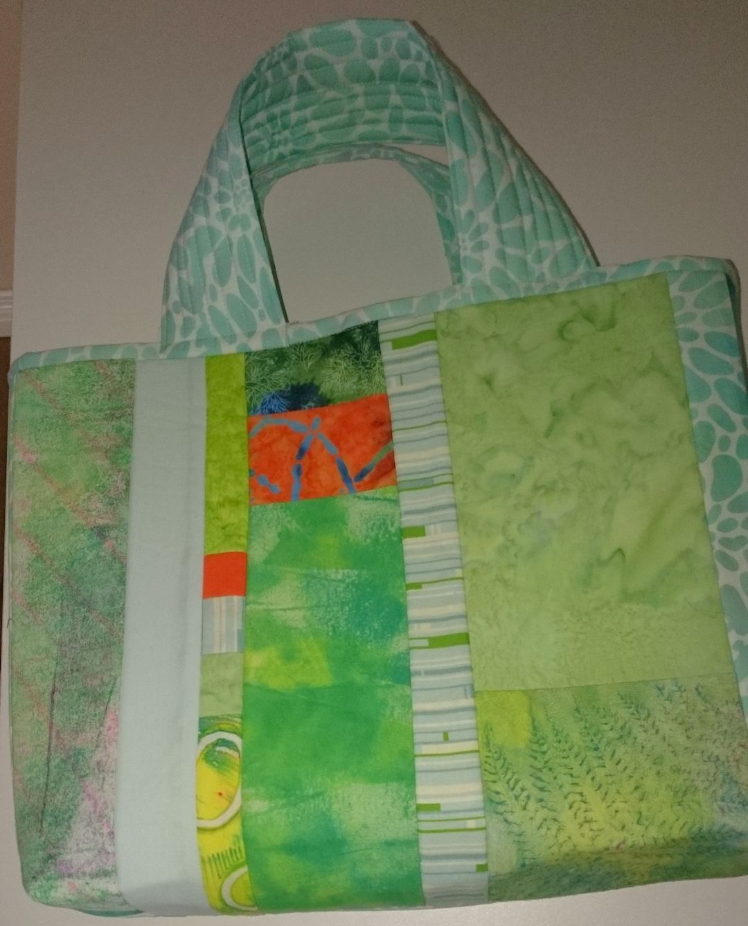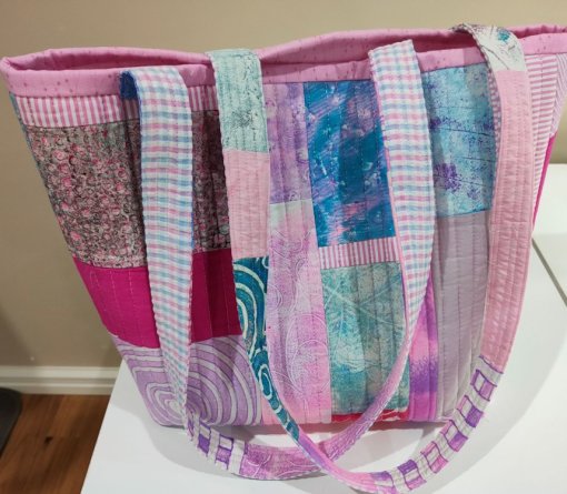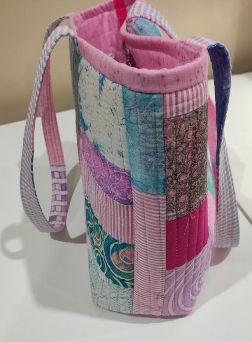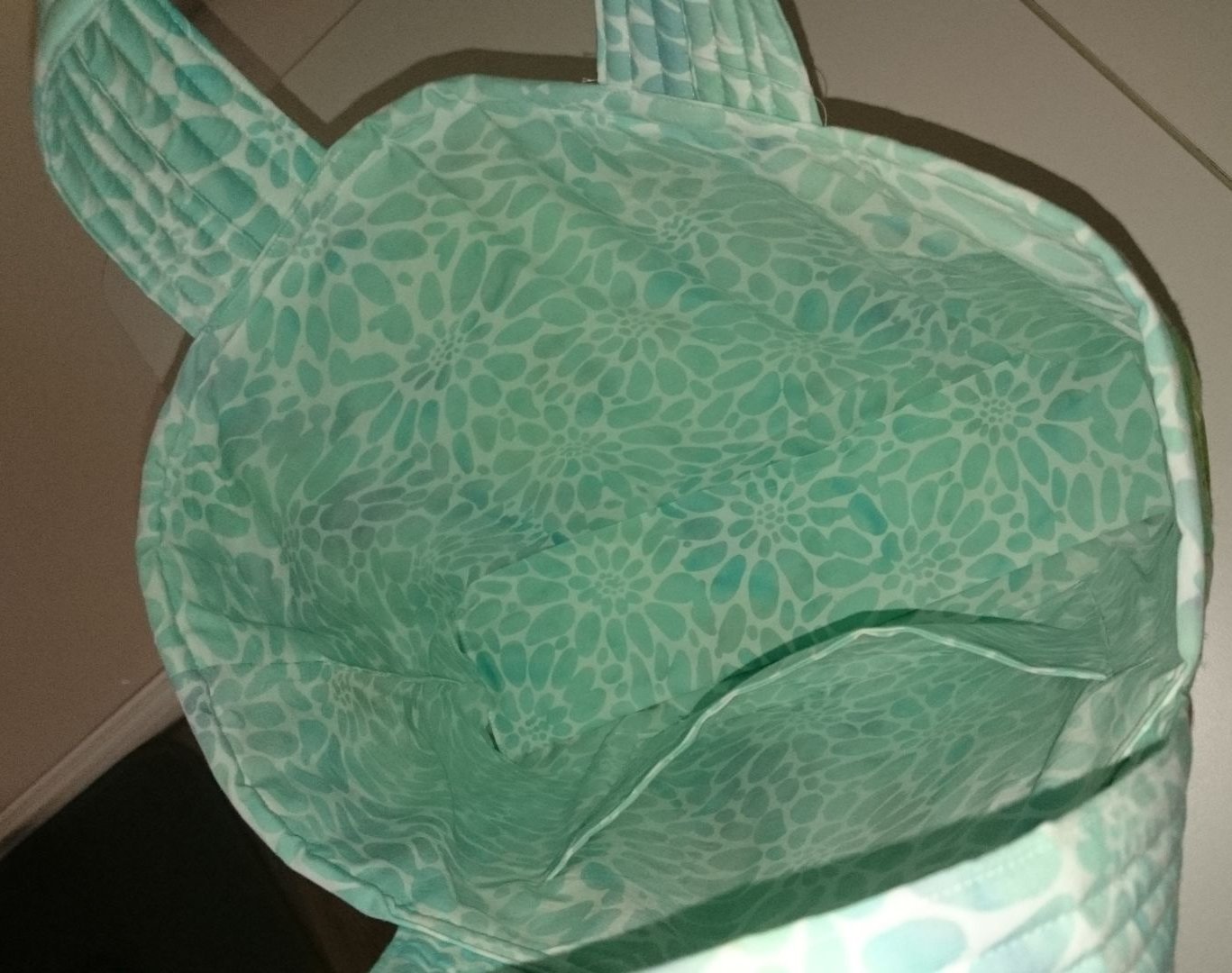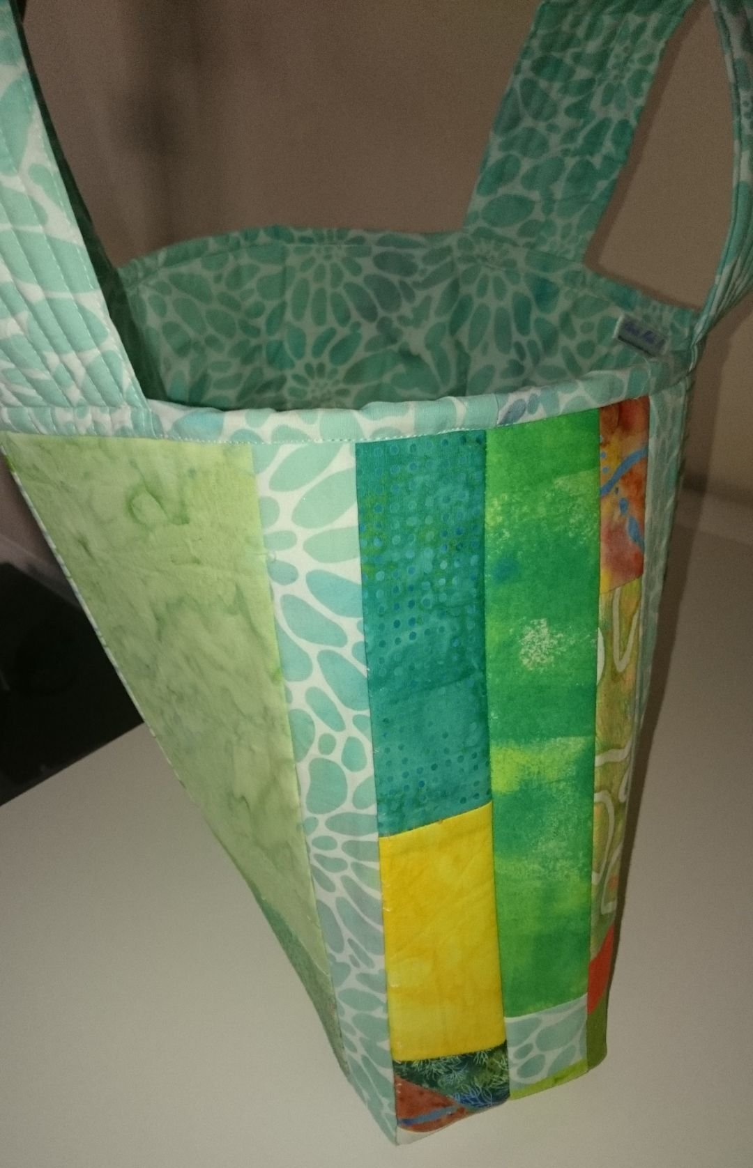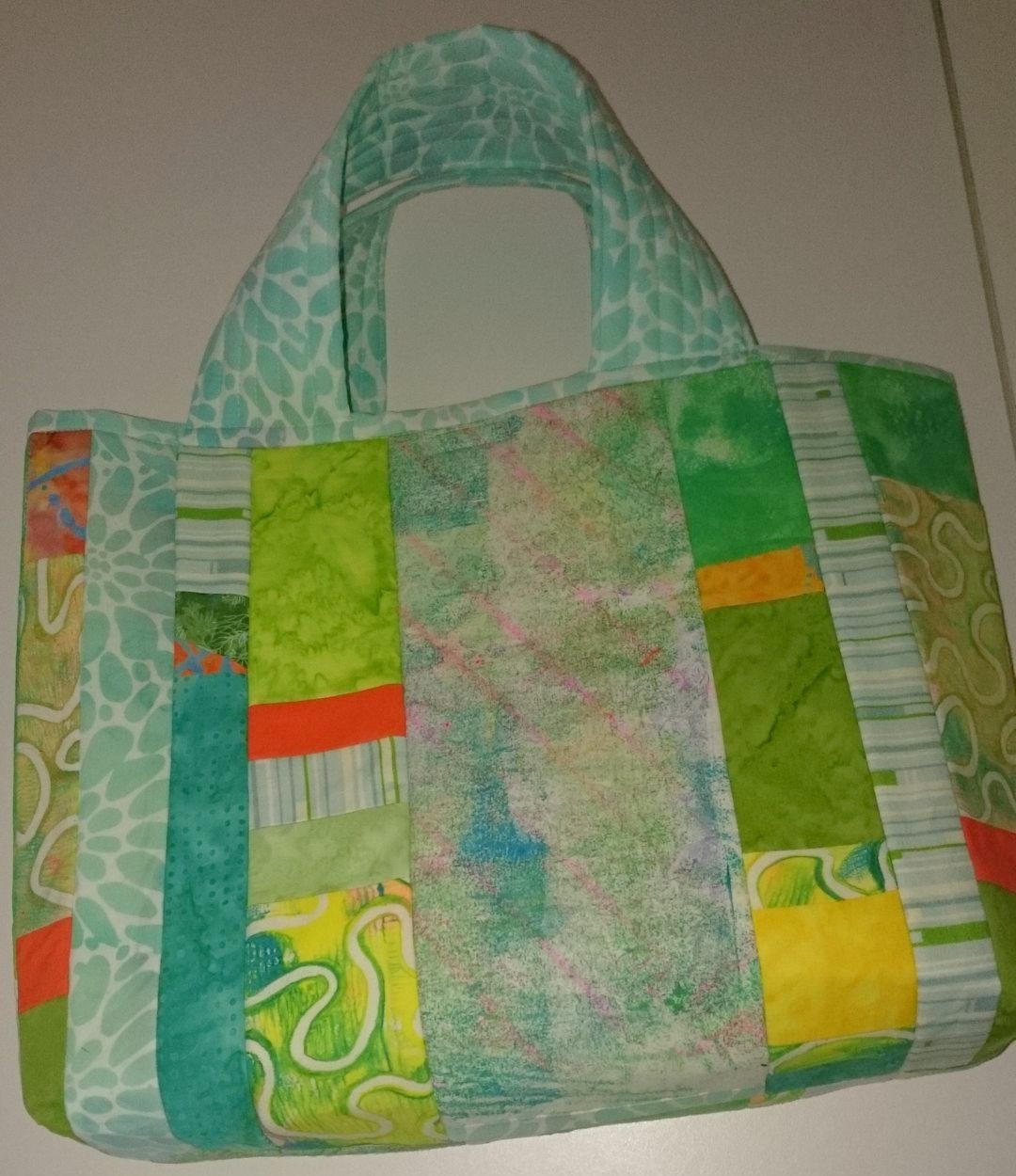 I attended the Quilt Symposium in Auckland, NZ a few weeks ago. I took two of Claire Smith’s classes—one on monoprinting and one on making a quilt-as-you-go bag. Today I combined them! I took the green/yellow tones fabrics I made in the monoprinting class, added some other greens, aquas, yellows and oranges from my scrap stash and made this bag. It took about 4 hours, as I had to remember what to do—Claire’s instructions were sparse… And a couple of weeks later I made another one, also using the monoprint fabric I’d made, this time in the pink/blue/purple colourway.