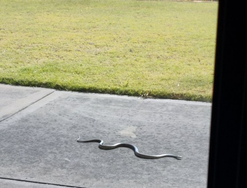 We’ve been in this house for nearly 10 years. In that time, I’ve seen plenty of Australian Wood Ducks (aka Maned Geese) when I’ve driven to and from town — they tend to live near the water courses on the low-lying land close to the estuary. And I’ve seen maybe three snakes (likely dugites) in 10 years crossing the road on that same drive.