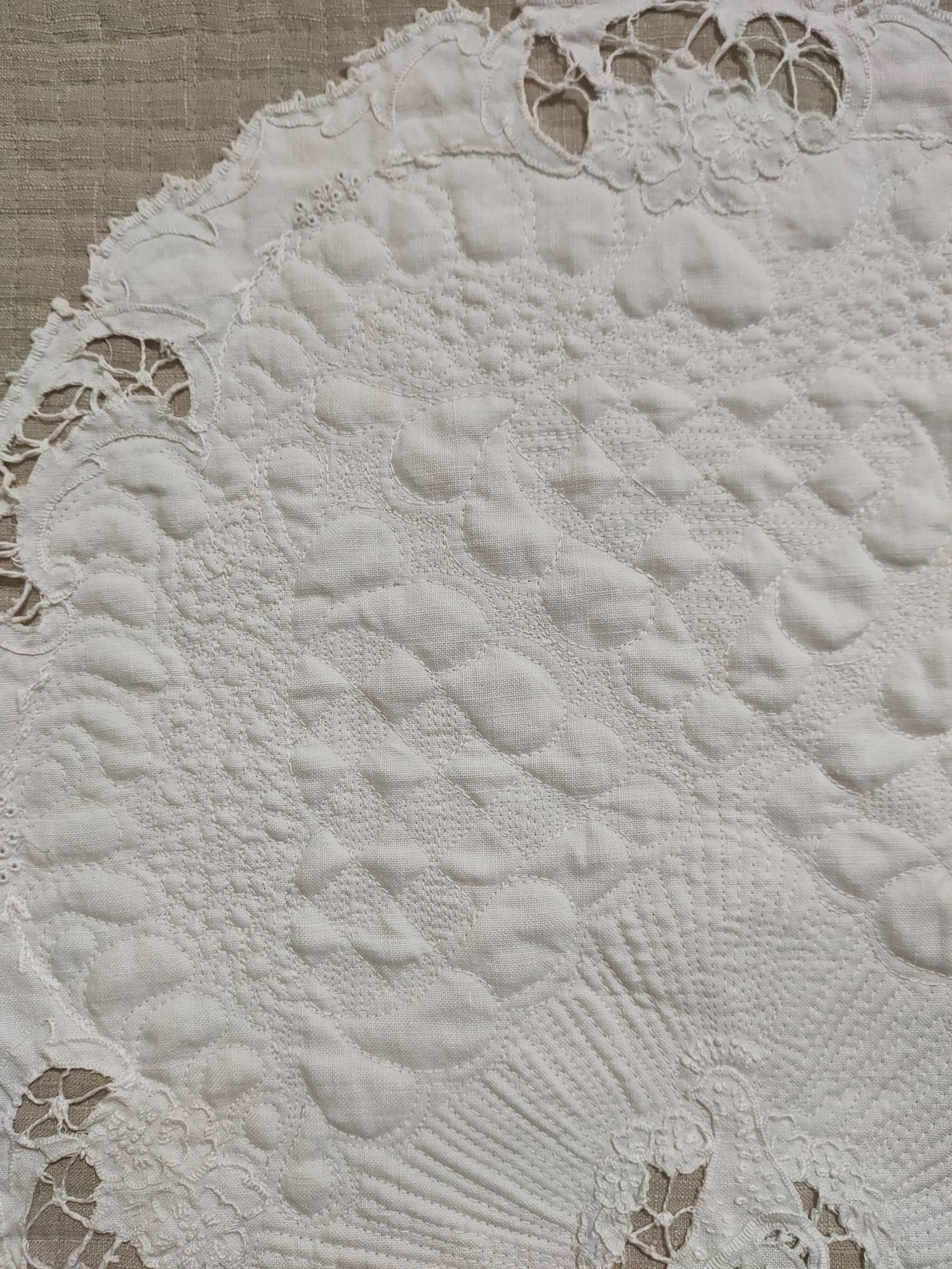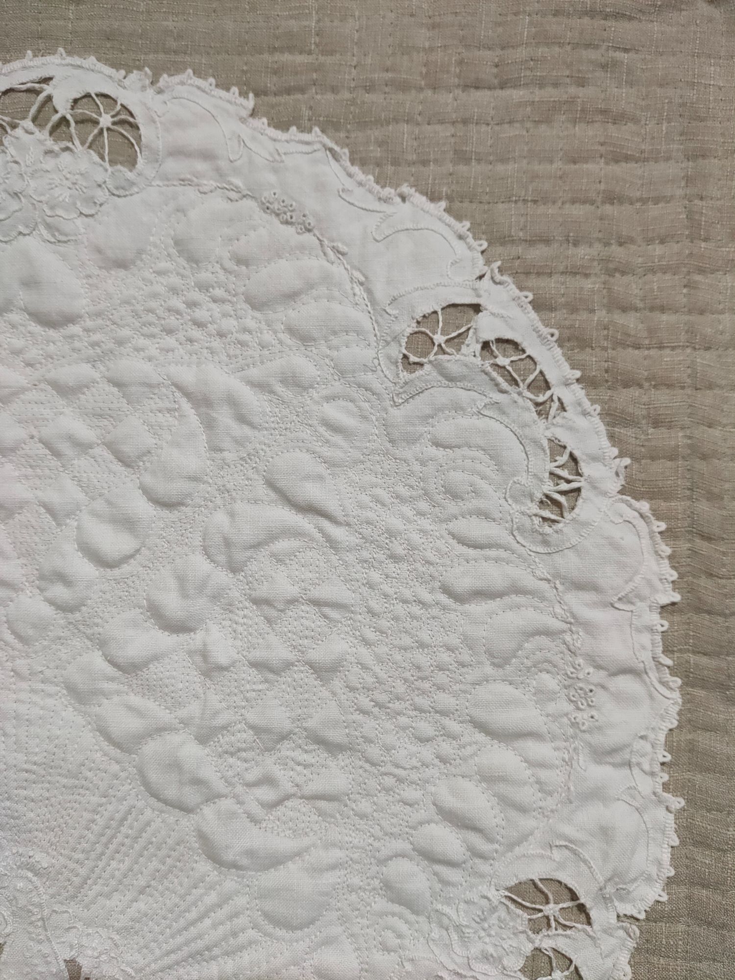 Back in April 2018, I attended Empty Spools at Asilomar (Pacific Grove, California), and was part of the 5-day class run by Cindy Needham. One of the small pieces I worked on in that class was a vintage doily on a soft taupe background. I did most of the quilting on it in class, but it has sat in my sewing room, incomplete, since I returned. Well, I finally decided to finish it off. There was only a small amount of cross-hatch stitching to do on the background, plus trimming it square and facing it (I didn’t want a binding on it, so I used this excellent facing method from Robbi Joy Ecklow: https://weallsew.com/make-quilt-facing/). Then I hand stitched down the loose edges of the doily.