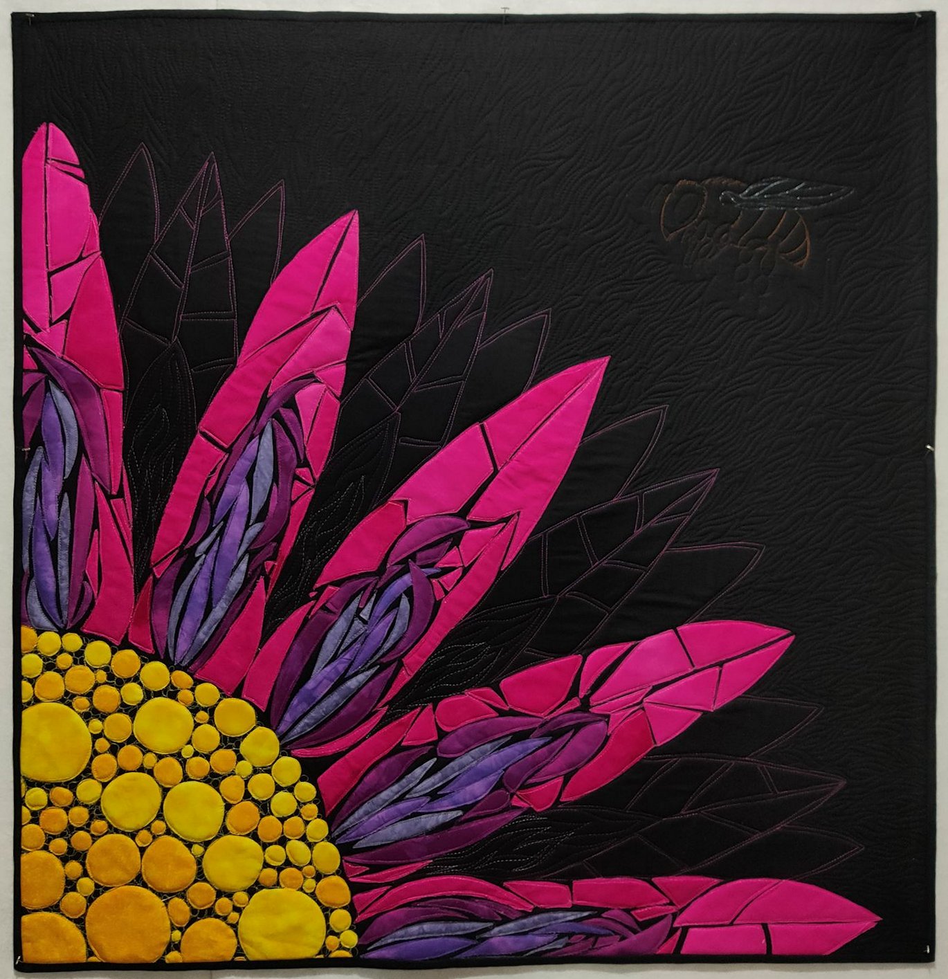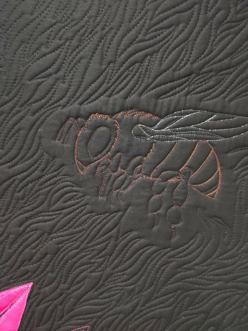 - FMQ’d the black background, leaving an area immediately around the bee unquilted.