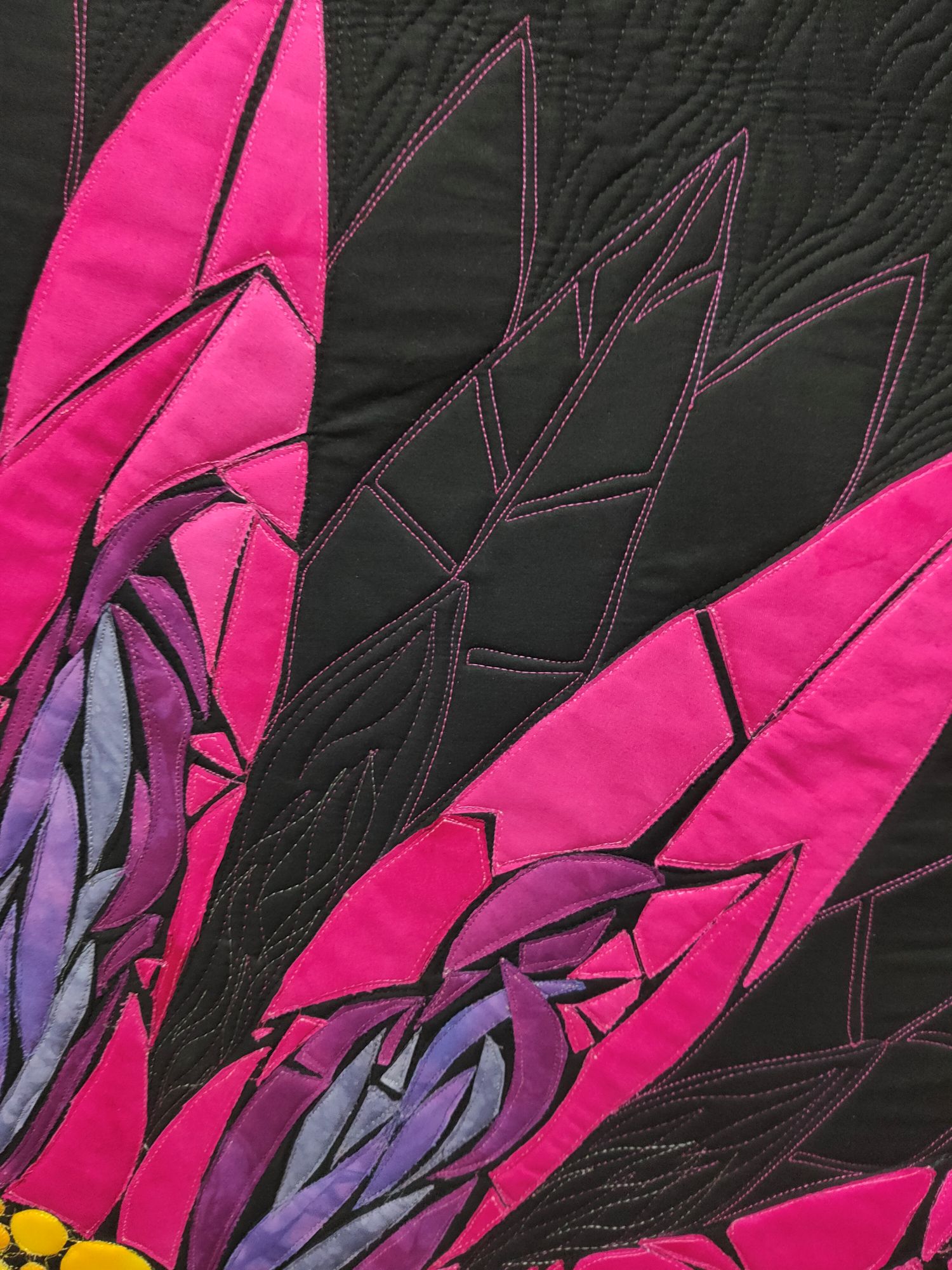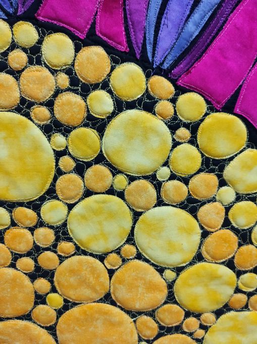 - FMQ’d more petals in between the appliqued petals, using threads that matched the colours in the appliqued petals.