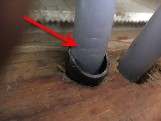- Approx 4:30pm the plumber attended. He went into the roof space, and located the source of the leak, which was still running, though not as much. It was the hot water pipe from the hot water system (HWS) to the en suite shower. He got us to turn on the hot water tap in the shower to drain the rest of the water out. The cause of the leak was a very small hole/tear in the pipe. The plumber took photos, then cut the pipe and capped it as a temporary solution. The plumber identified only one insulation batt that was quite wet and removed it from the roof space; he put it in a large garbage bag and we put it in the bin.