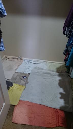 - Meantime, we were running around madly trying to mop up the water from the carpet in the WIR and outside it, and remove clothes and shoes that had been wet by the leak, as well as storage boxes on the top shelf of the WIR.