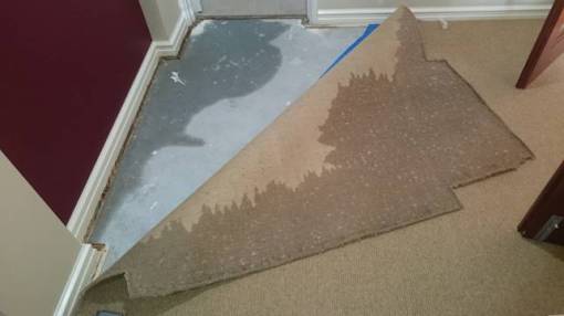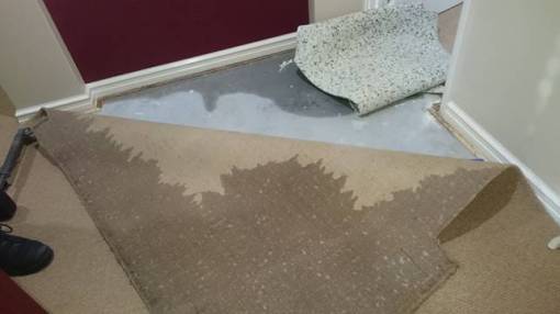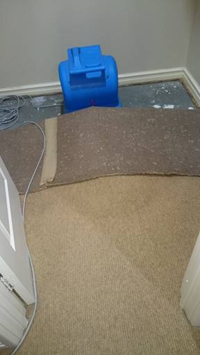 - I called three different carpet cleaners before I found one (Village Carpet Care, Bunbury, Western Australia) that had the equipment and knowledge to extract water from carpet in the hope of rescuing the carpet from potential mould and avoiding replacement. They came late in the afternoon. The carpet guy pulled back the carpet, cut out the wet underlay, extracted as much water as he could and left us with two floor-level fans (not heated—heated fans promote mould!) to help dry out the carpet and concrete slab. He will come back next week after everything is dry to re-lay the underlay and carpet and treat and steam clean the carpet. After the underlay was removed and the carpet peeled back, the extent of the water damage—both inside the WIR and outside it—was revealed. In addition to the carpet, the concrete slab in the WIR and outside it was wet, as was the wood holding the carpet in place, and very likely the skirting boards and wall between the WIR and the entrance to the en suite (still to see evidence of moisture—the handyman and the carpet cleaner both said it could takes weeks or even months to know the full extent of that damage). After extracting the water, peeling back the carpet, and cutting out the affected parts of the underlay, the carpet guy placed two powerful floor fans—one in the WIR (under the lifted carpet) and one at the entrance to the en suite—to dry out the carpets. We had these fans on constantly from 8am to 11pm for the next few days, and kept the windows in the bedroom and bathroom open for cross-ventilation, as well as running the exhaust fan in the WIR for those hours, and the air-conditioning. The aim was to extract as much moisture as possible from the carpets and save them from being replaced, if possible.
