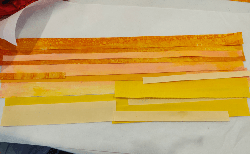 Much of what we did is now lost from my memory (the changes in our world in the next few days, weeks, and months after the retreat dominated everything and so the details are now gone). But we did start with painting our 1 m pieces of white fabric. Because I knew I was going to do something based on fire, I painted an array of sunset colours from yellow through to deep orange. Once dry, we cut strips of fabric for our background from both our hand-painted fabric and any commercial fabric we were using and lightly stuck these down on another piece of 1 m white fabric, moving them around as required. I think freezer paper was involved.