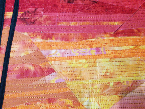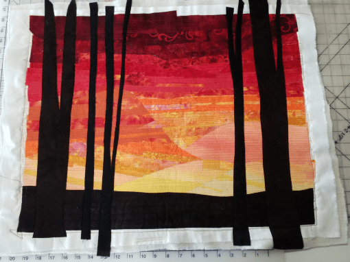 The theme was ‘The Abstract Landscape’ and we could use one of our own photos for inspiration, or one of Gloria’s patterns. Gloria also had hand-painted and hand-dyed fabric for purchase, or we could use our own fabric—commercial fabric and/or fabric we painted on the first day of the retreat. I used my own fabric with some from the piece I painted. The inspiration for my piece was a group of photos taken by others during Australia’s devastating bushfires in December 2019/January 2020. I didn’t use one particular photo, instead getting inspiration from the colours and silhouettes in them all.