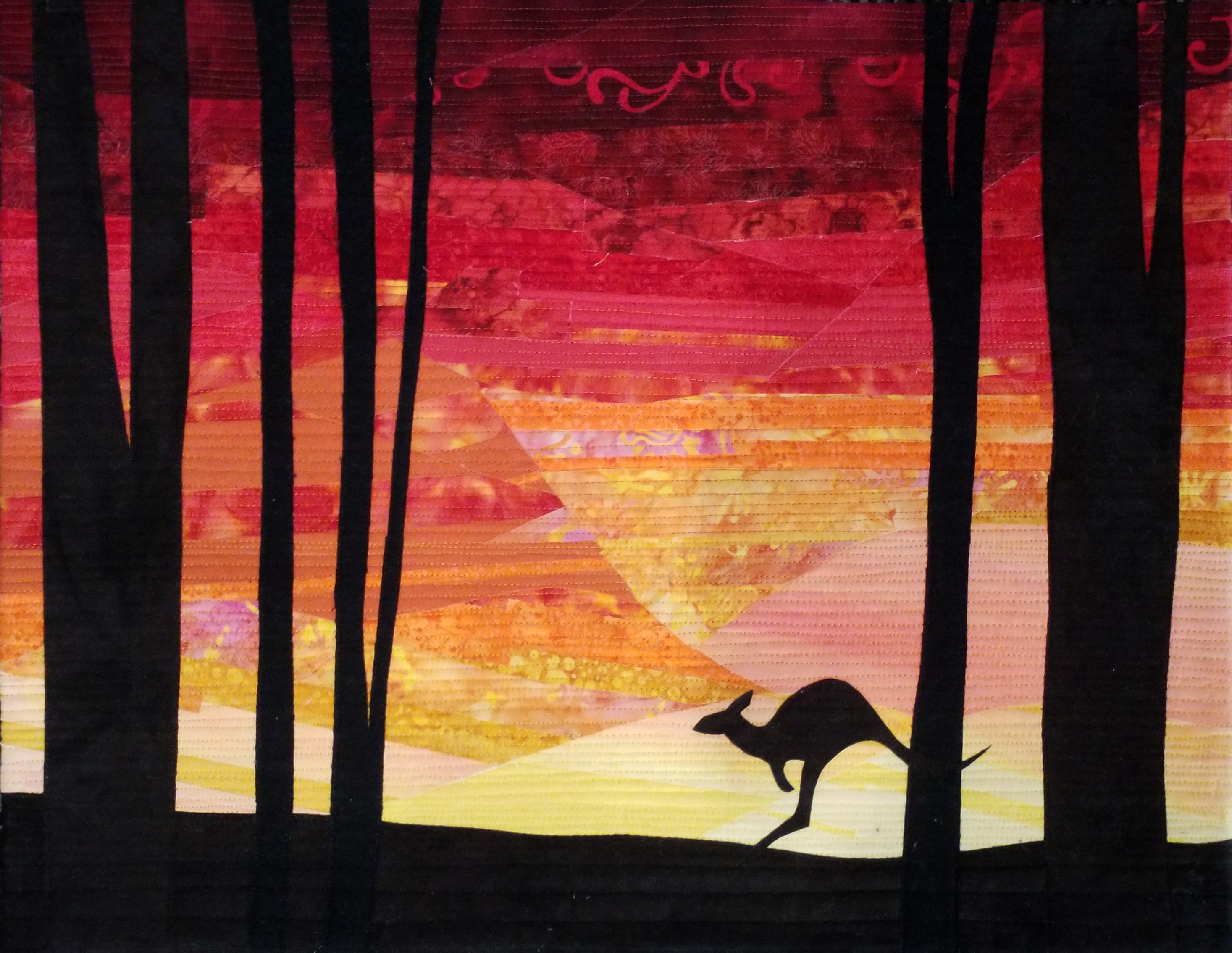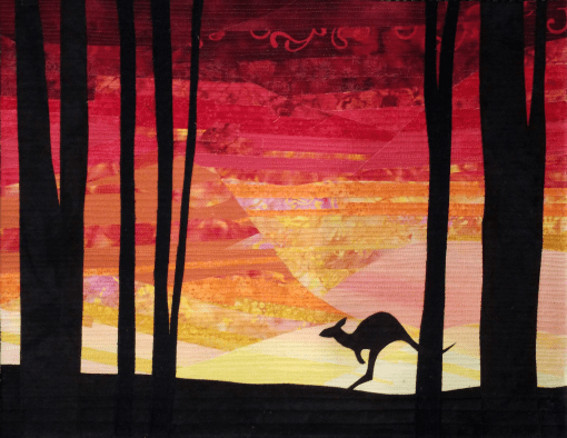 I then added batting and backing and quilted the piece just using straight-ish horizontal lines across the background and leaving the trees unquilted (except for some very close top-stitching to secure them safely to the quilt). But it was missing something to give perspective and the sense of enormity and hopelessness of these fires. So I hunted out a silhouette image of a kangaroo in full flight and added it in. Finally, I used Robbi Joy Eklow’s facing technique to finish the quilt.