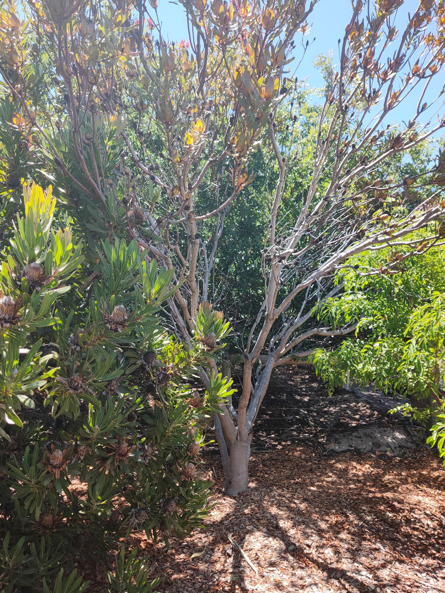 Almost dead protea. Its root base had been attacked by termites several years ago, and it tried to hang on too, to no avail