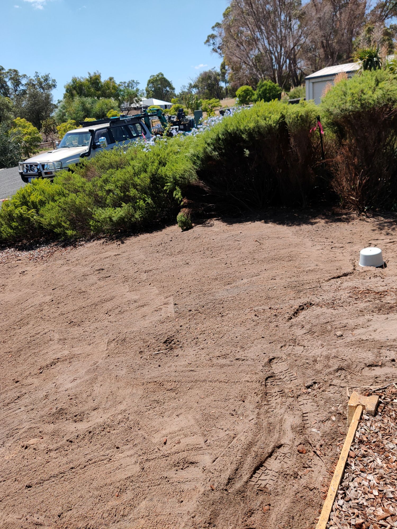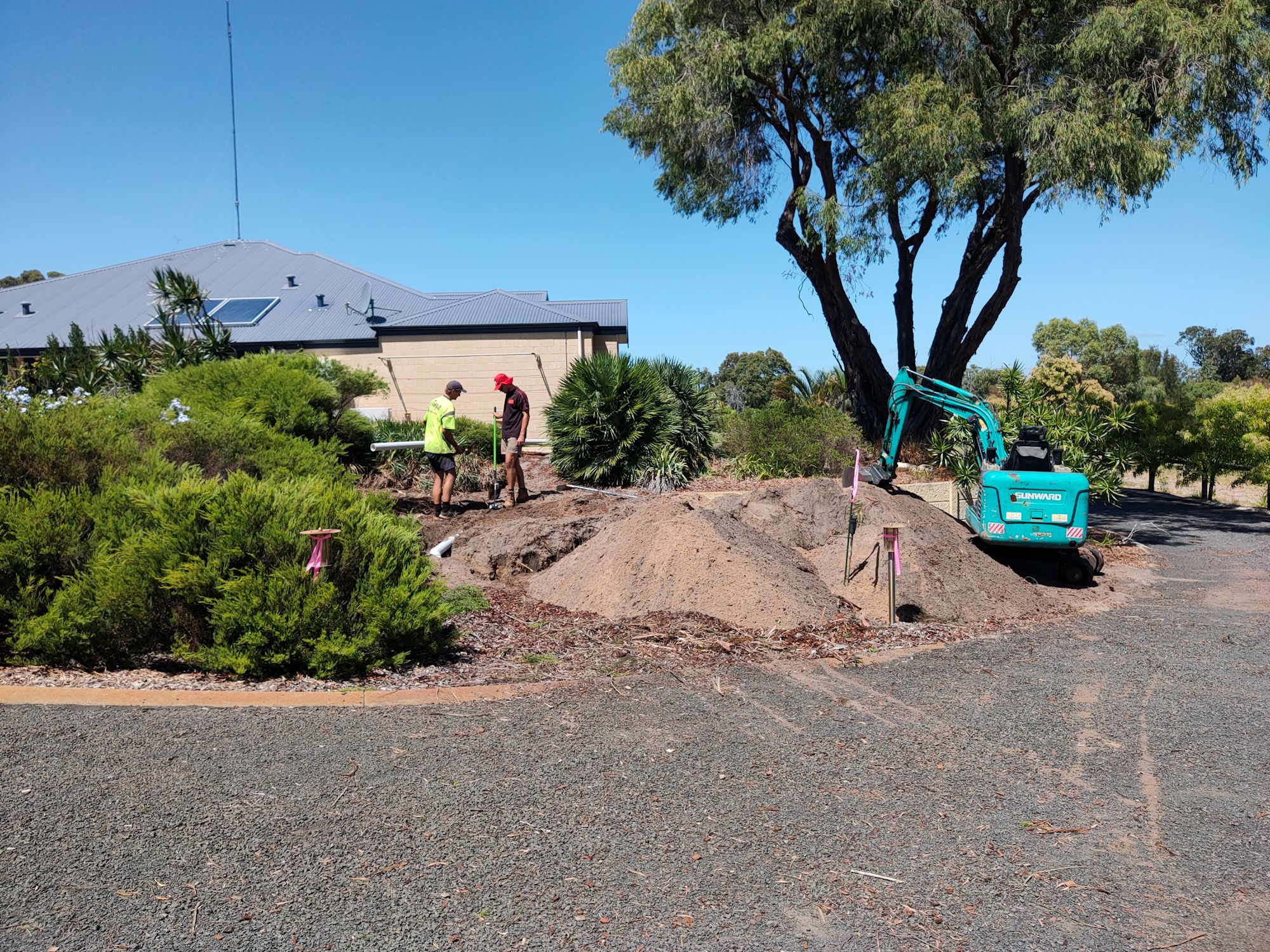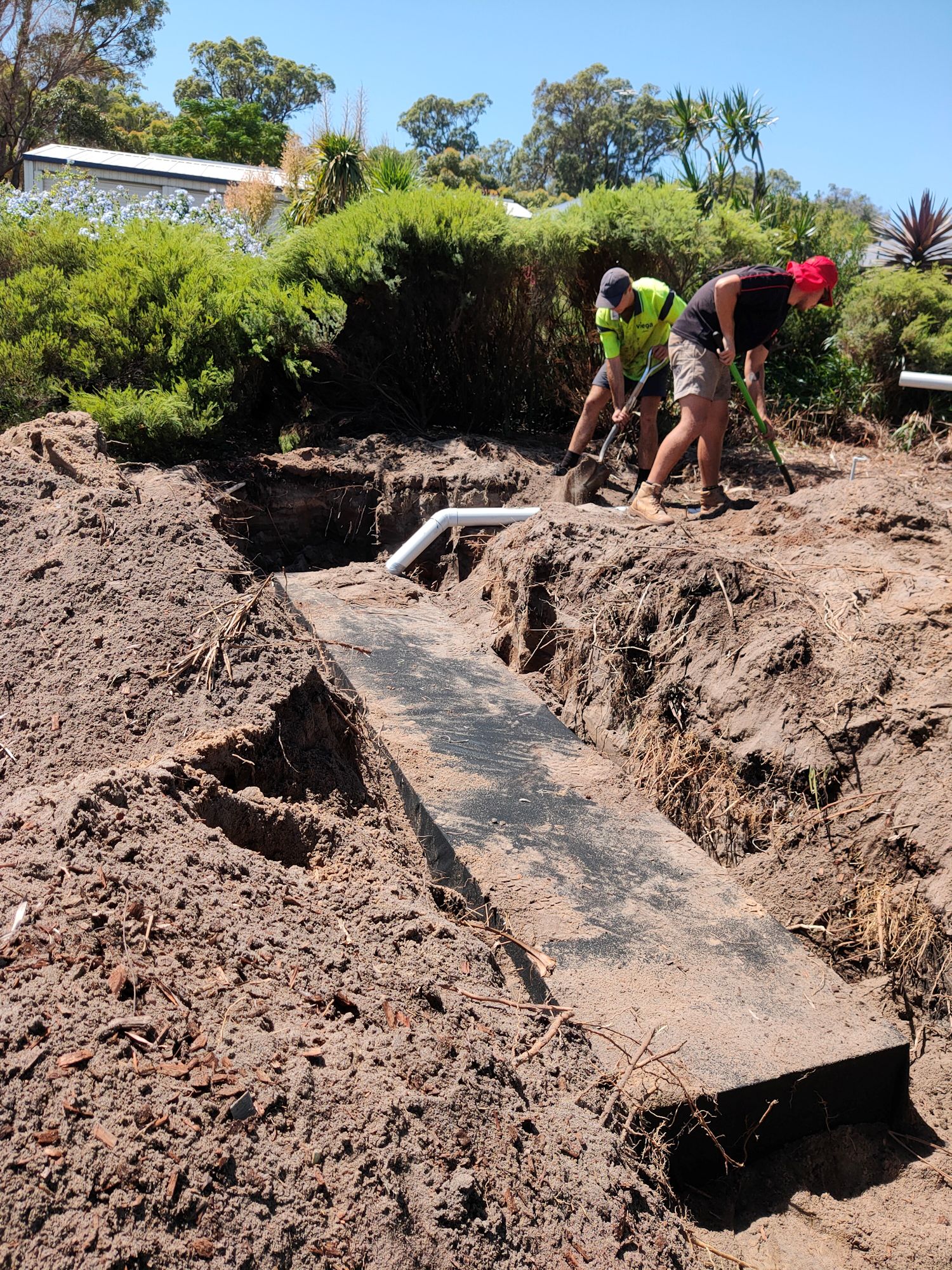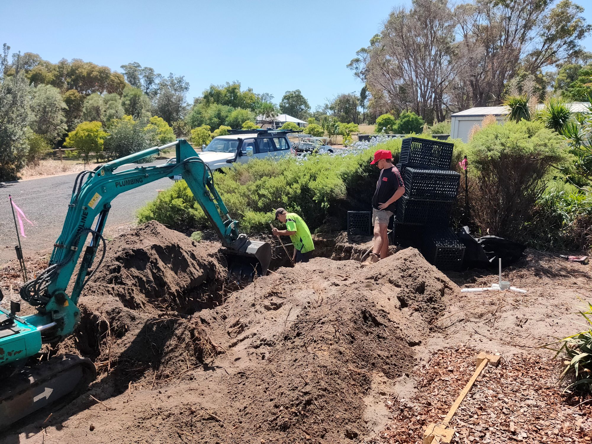 The plumbers came this morning to clear the vegetation and install the new leach drains. I didn’t have to have the other drains found and pumped because they could be capped and left to dry out on their own over time. New pipework from the septic would be used for the two new drains. With a digger and 3 people, it was all done and cleaned up within 4 hours! In addition to the cost (several thousand dollars), I also had the cost of a 5 cubic metre general waste skip bin ($260 for 6 days), but no extra cost for pumping out the old leach drains. The plants can suck on those for a few more months.