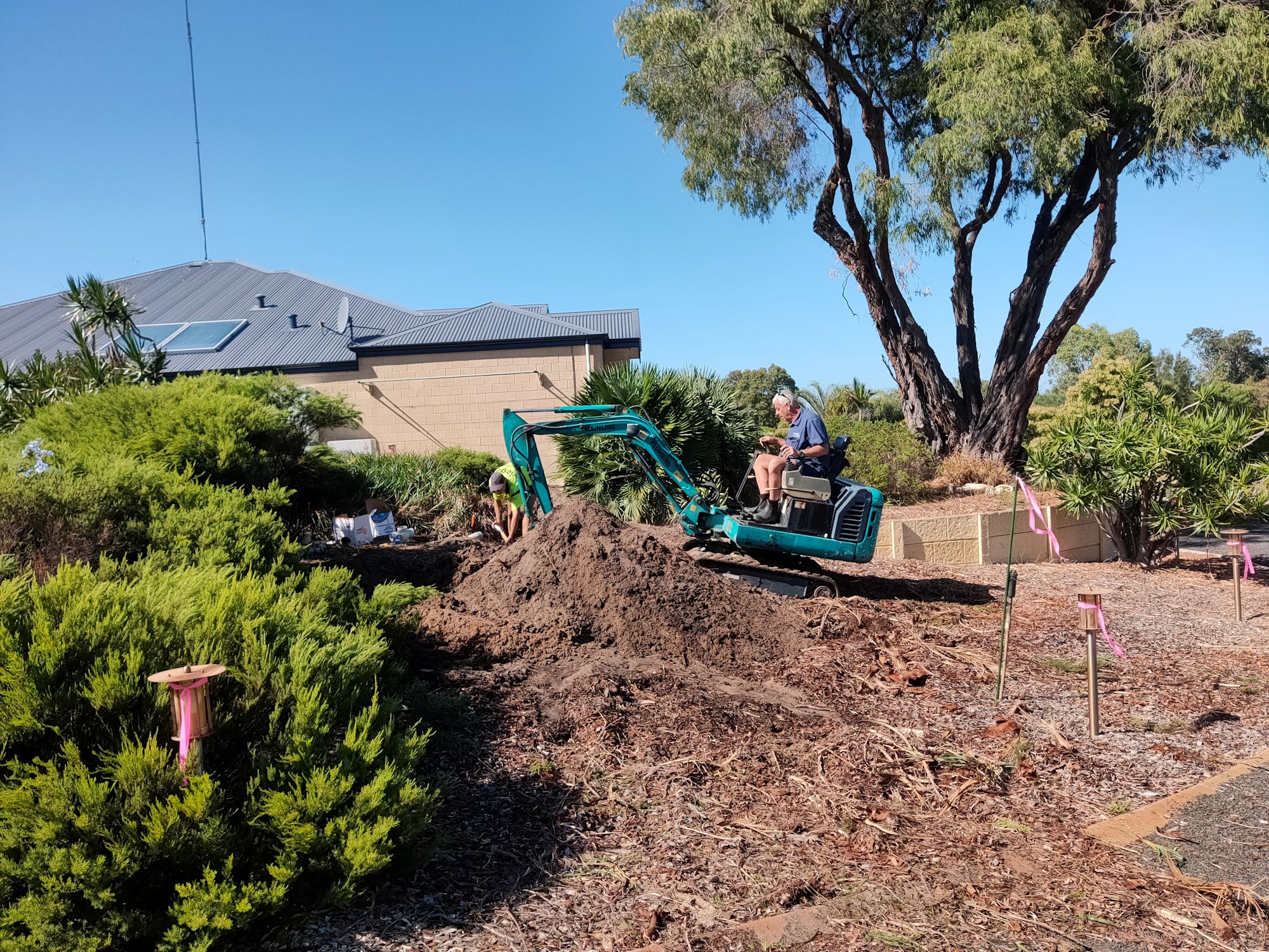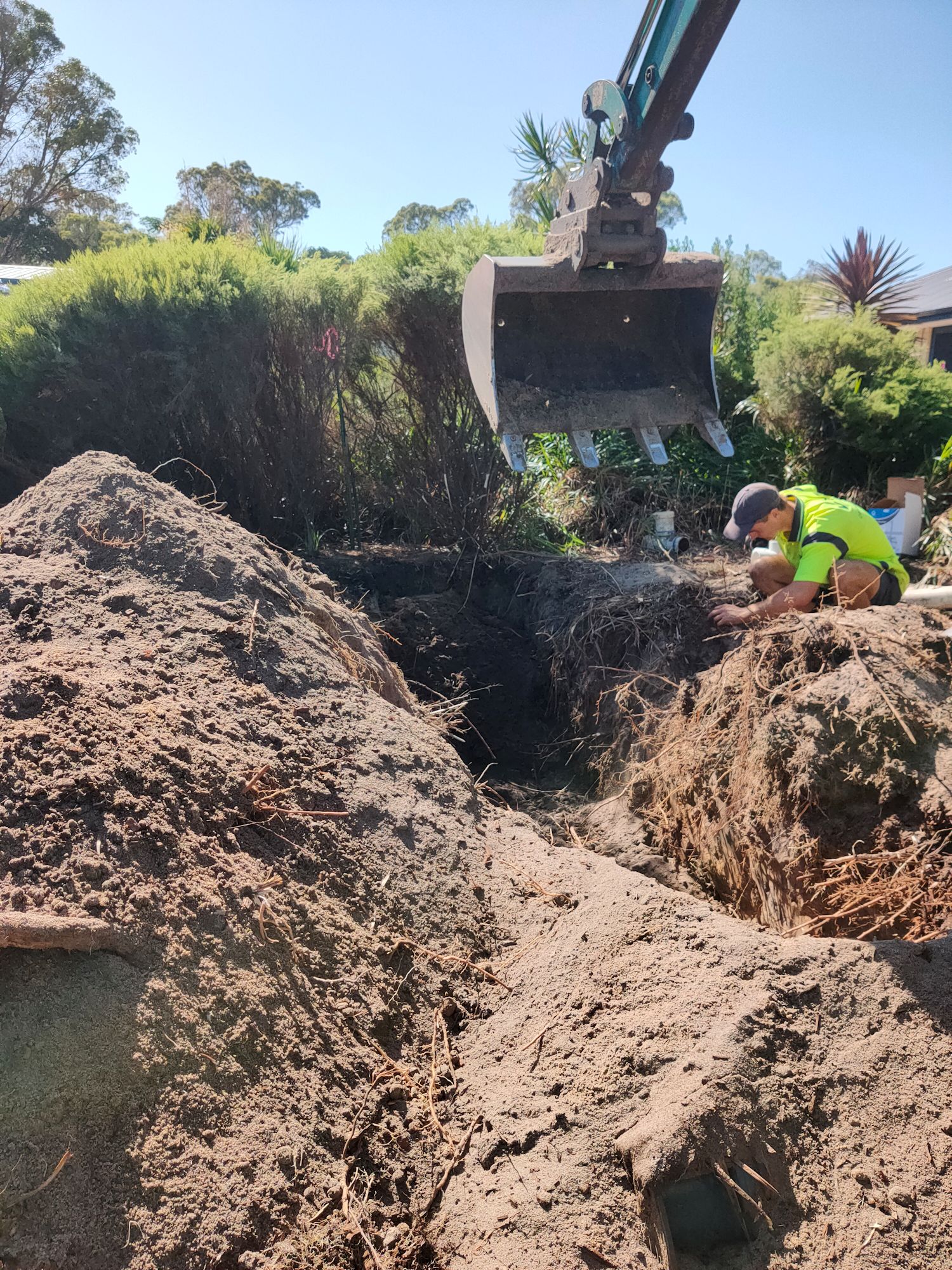 Despite what it looks like, the plumber is fiddling with pipe fittings some distance from the digger. Note the roots in the trench—the plumbers suspect root ingress was the reason for the failure of the old drains