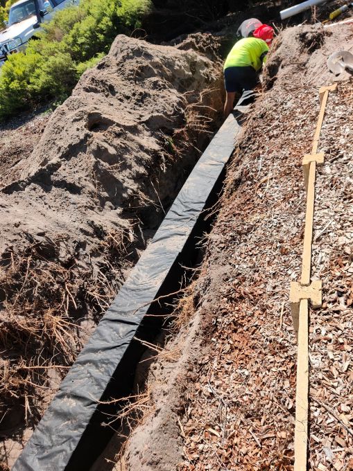 The first leach drain, covered in geotextile fabric, is in place and the trench is ready to be filled