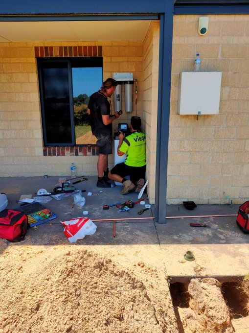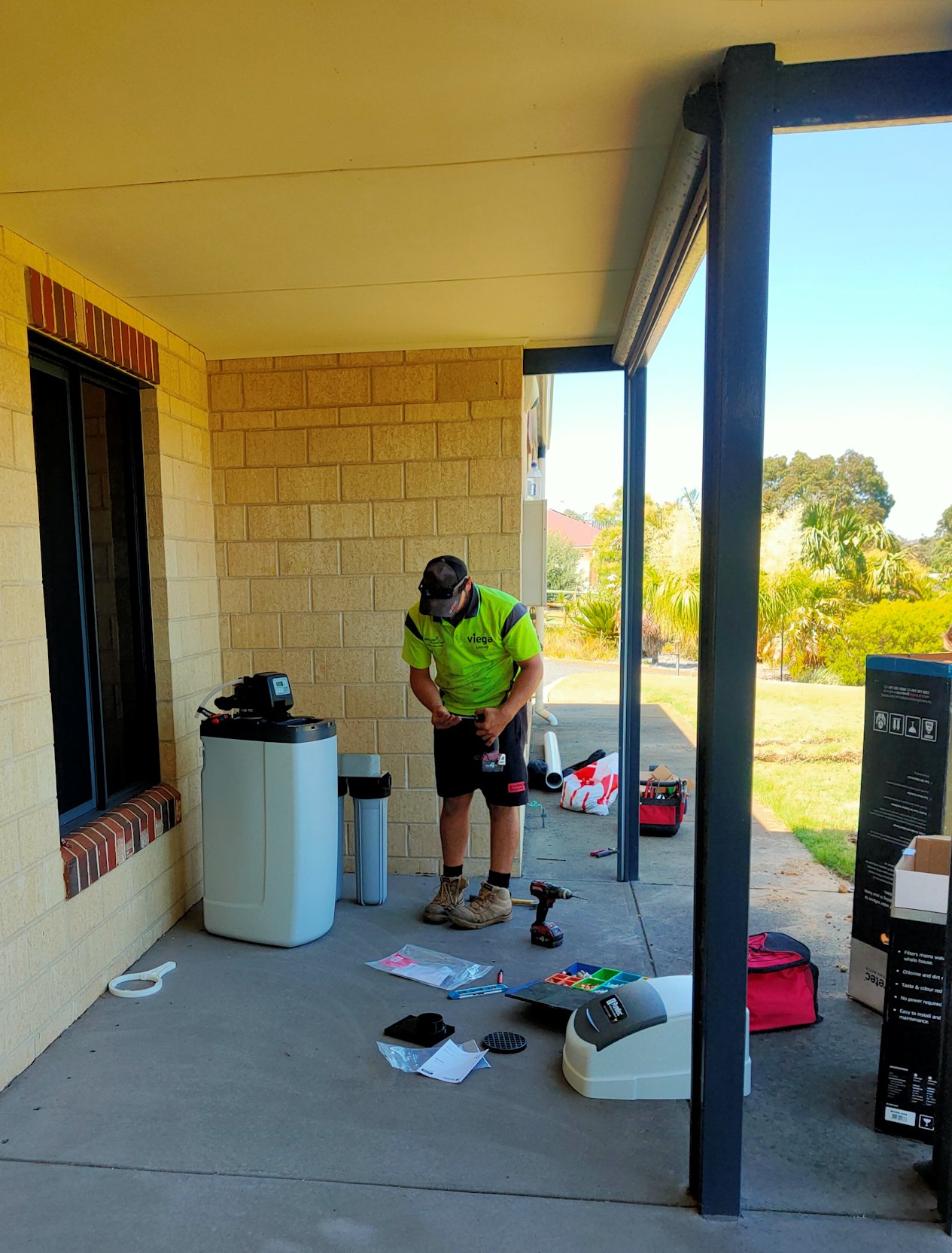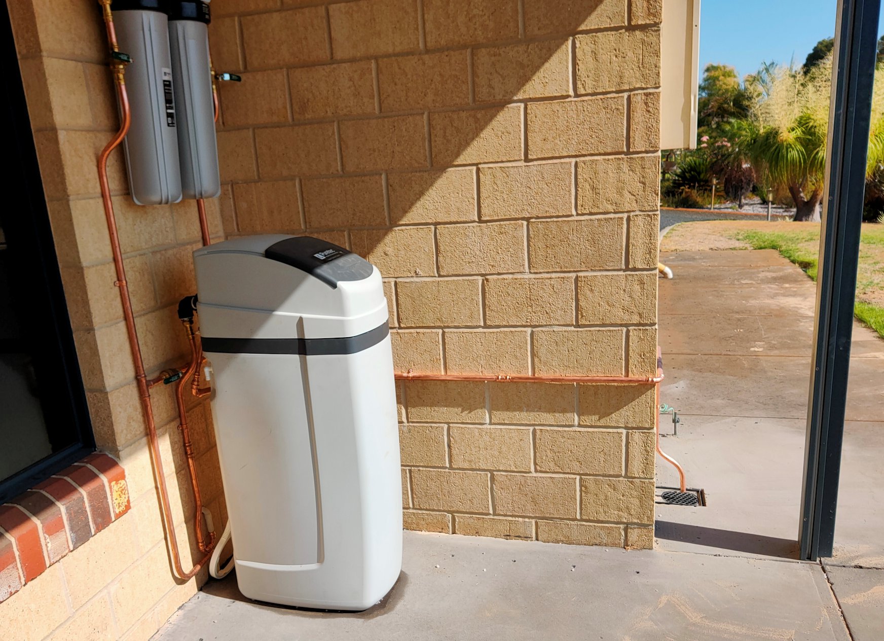 We had a water purifier and softening system installed earlier this week. Our water here is really hard and full of chemicals such as copper, calcium, and lime, which cause all sorts of scale issues in the pipework, the HWS and other appliances, as well as unsightly blue/green and chalky residue on porcelain, taps, showerheads etc. But you can’t just buy a system and install it—there has to be drainage for the monthly purge of the system, which meant a soakwell and a new drain under the concrete slab, plus all the pipework to route the water from the mains point into the house through the filtration and softening system, and a new electrical point for the pumps for the monthly purge. The plumbers and electrician did a great job in the stinking hot weather!