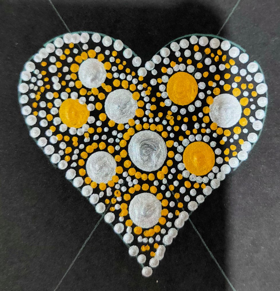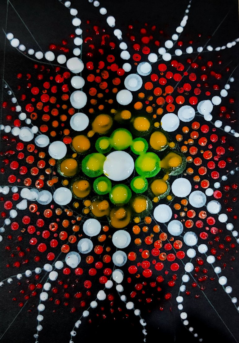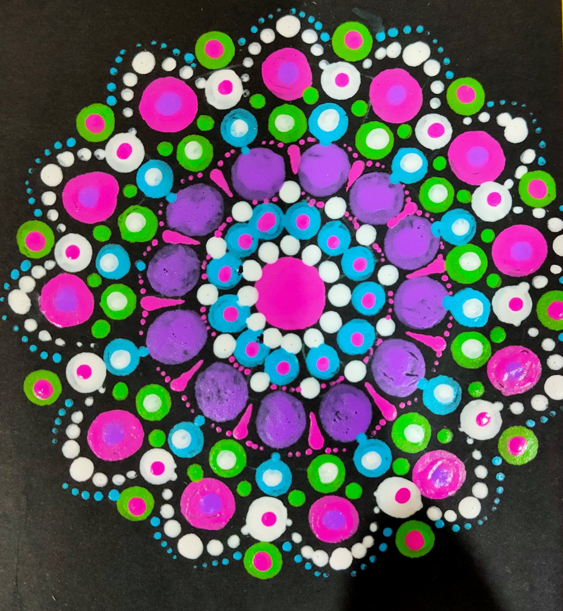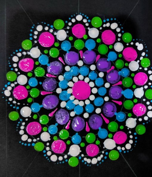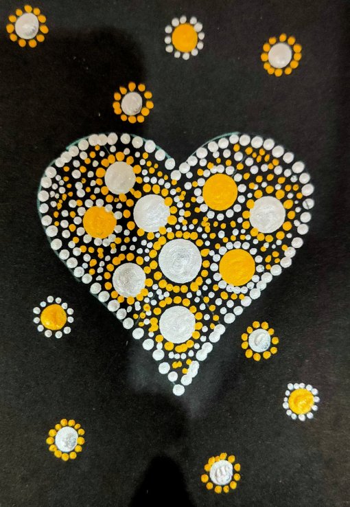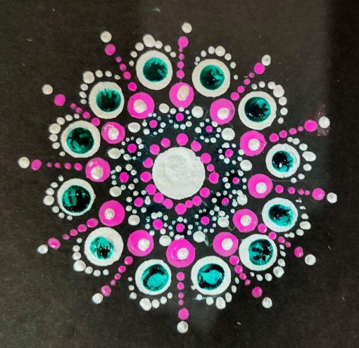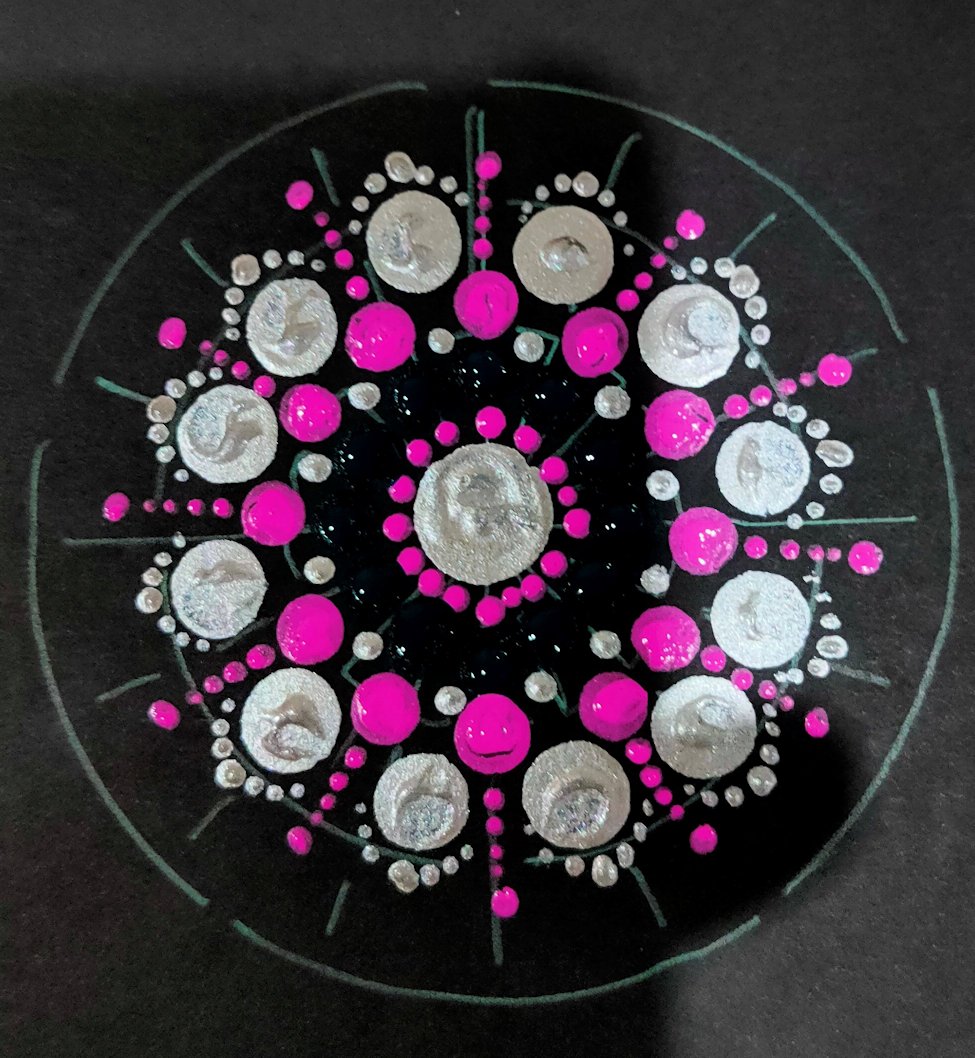 I’m trying dot art for the first time. My initial attempt was a few weeks ago, but I’ve learnt a bit more now (thanks YouTube!) and have practised some techniques. Doing these mandalas is very focusing, so it’s good for mental health. I still have to get the paint consistency right, but these were some I did yesterday and today. All are on one half of black card suitable for a greeting card. Some were still wet when I took the photos so the chalk registration marks are still visible—I’ll erase those when the paint dries, and likely add more dots on top of the existing dots. The one with the page fully covered is from earlier in the week, and I added more dots over the other dots, pretty much filling the black card. The hardest thing at the moment is getting that centre dot perfectly lined up. More practice needed there, as the position of the centre dot dictates how accurate the placement of the others dots is. At the moment I’m using mainly the ends of things I already have — various paint brushes, pencil eraser ends, satay sticks, and a set of dotting tools for nail art, which create VERY small dots. I’m waiting on delivery of a range of tools developed just for dotting, in a range of sizes, and I think I’ll mark registration marks on the bigger tools so I can centre more precisely. I’ve also been using some quilting stencils I have to get the shapes