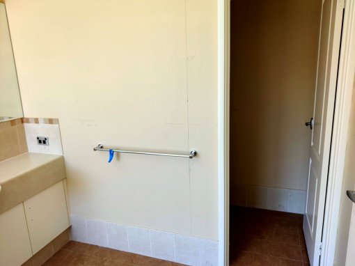 Photos below (9 Feb 2023) after we removed everything, including the handles on the vanity! (I kept them because they’re the same as the handles in the kitchen and if one of those needs to be replaced, we likely won’t get an exact match as these handles were all put in when the house was built, around 2005, and I can guarantee you can’t get exact replacements!). The blue tape labels the things we want them to take off for us to keep, and NOT throw in the skip bin—the second bathroom can use another towel rail and we may have someone who will take the mirror. And the pencil lines on the wall (there are a lot of them, mostly not seen in the other photos) show where the door to the en suite will be widened to. The toilet door will be widened even further as it is much narrower again.