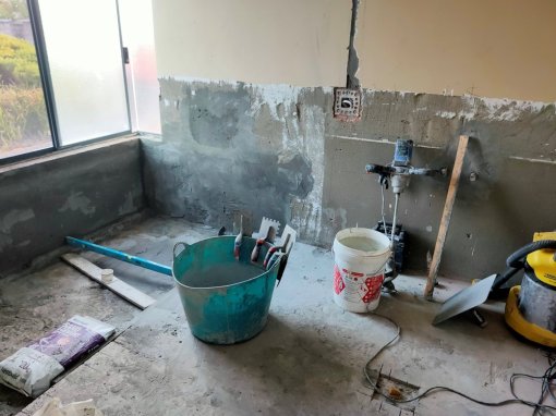 Another cool thing—back in the day, tilers etc. would mix their cement outside and bring it in with a wheelbarrow, which is not good for the floors it has to cross to get to the en suite bathroom. But these days it’s a bit different. Our tiler mixes in situ, using one of those big plastic tubs (the blue one in the photo) and a mixing machine that’s like a big blender! Easy peasy, and no mess! The only thing that comes from outside is a garden hose to add water to the mix.