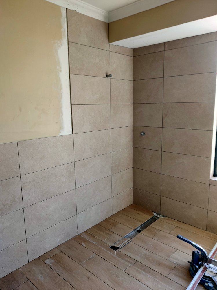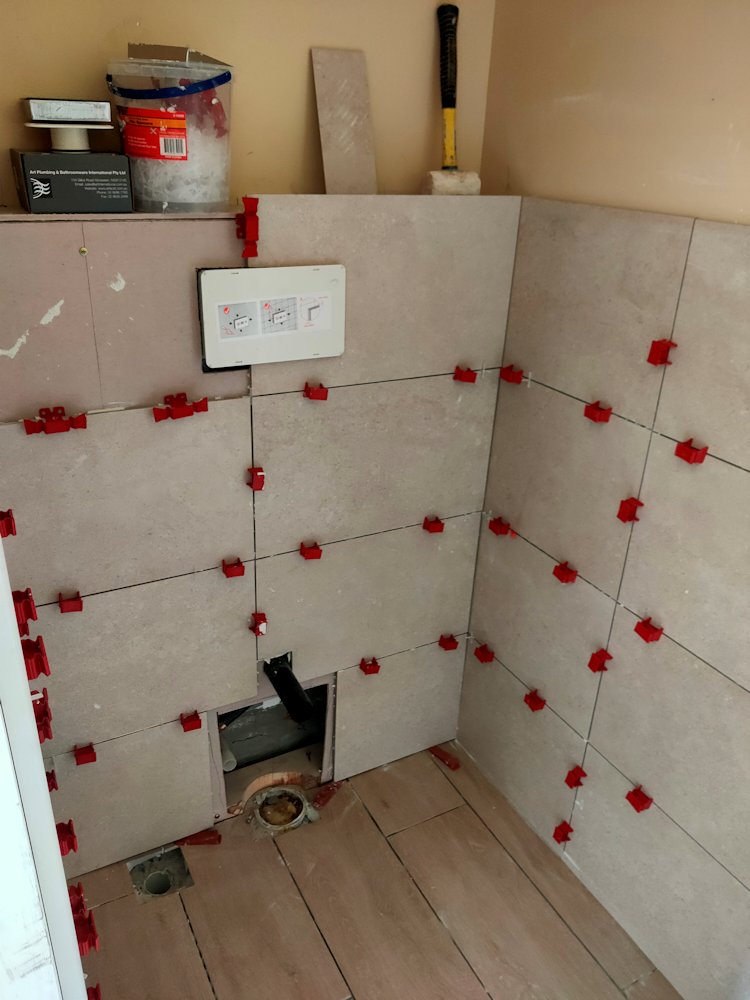 The tiler and project manager (PM) here bright and early this morning. By lunchtime, the tiler had finished almost all the wall tiling, the PM made the surround for the in-wall toilet cistern, which the tiler mostly tiled. More time to cure, so they’d both left by lunchtime. The tiler will finish the last bits of tiling tomorrow and then do the grouting.