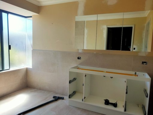 Double towel rails on the wall opposite the walk-in shower (DH is ~1.9 m tall, so the top one is for him!). If we need more towel rails, they can go on the back of the sliding doors (I’ve already checked this with the PM). Oh, and the vanity top, doors and handles have been added.