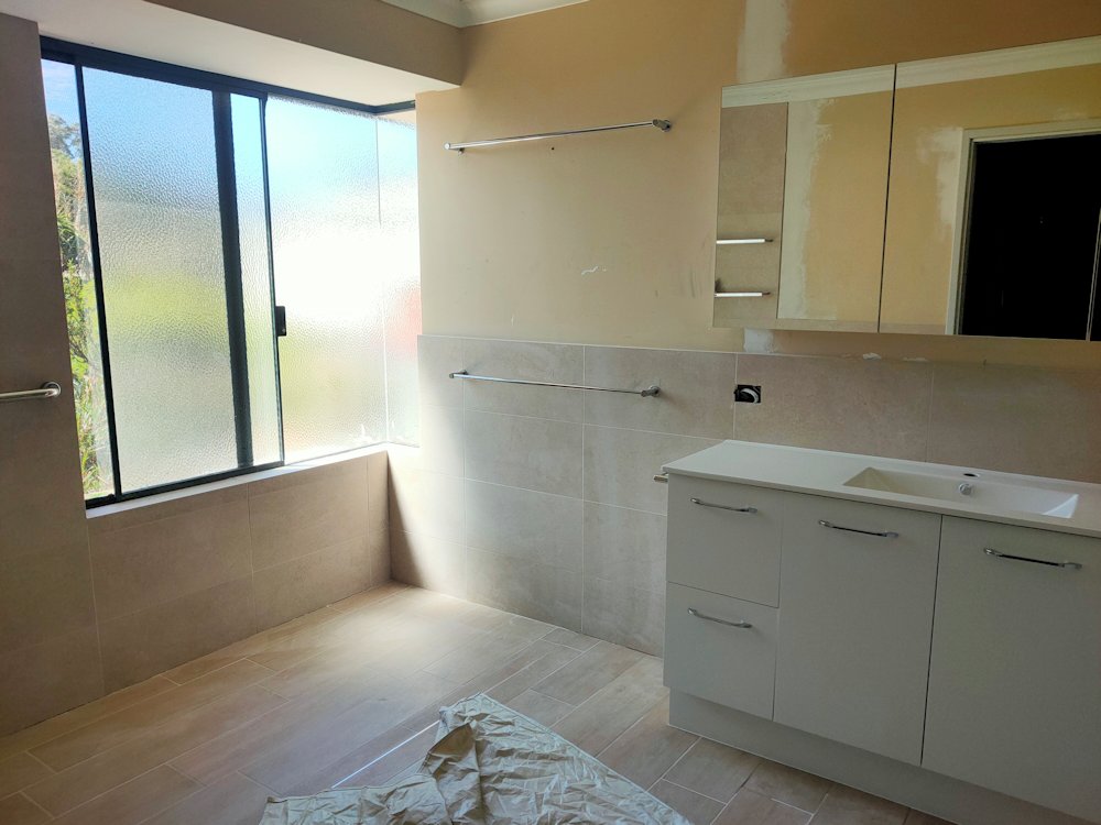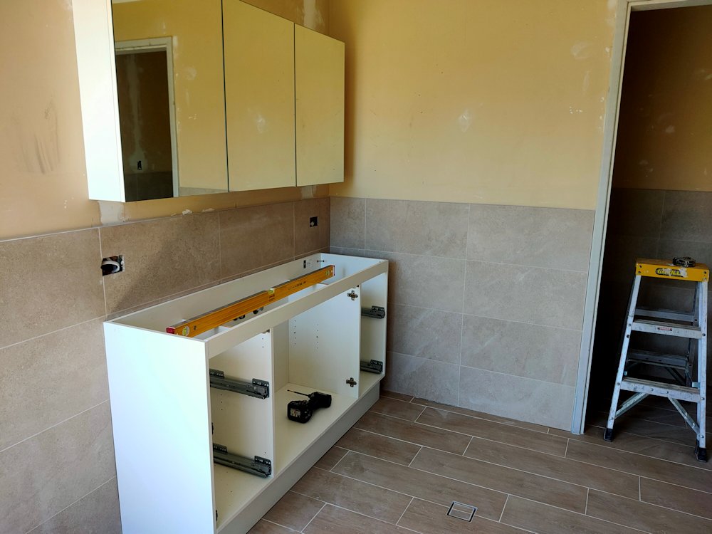 Double towel rails on the wall opposite the walk-in shower (DH is ~1.9 m tall, so the top one is for him!). If we need more towel rails, they can go on the back of the sliding doors (I’ve already checked this with the PM). Oh, and the vanity top, doors and handles have been added.