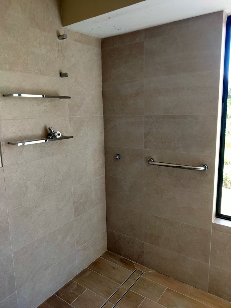 Double shelves in the shower because we BOTH have shampoos etc. These were going to be side by side, but the position of the pipework behind the walls and the narrow gap for the shower hose meant that wasn’t a good option in reality (it looked good on paper, but sometimes you have to make compromises along the way, such as the position of the mixer tap for the shower—that was meant to be much closer to the window, but the hot water pipes for the whole house are behind the first set of tiles on that wall and the pipework for the shower and its tap cross those pipes so we couldn’t put the tap there without ripping out the whole wall (a load-bearing wall) and starting again—not going to happen!). Also a grab rail for holding onto when you clean your feet and between your toes.
