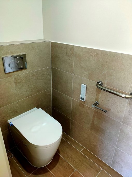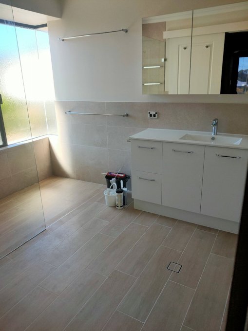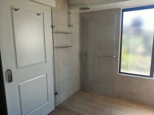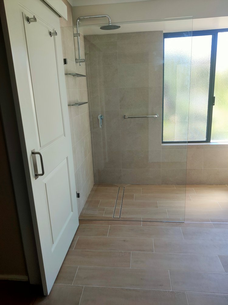 The frameless shower screen got fitted today (the silicone has to dry for about 24 hours) and the PM was here for several hours refitting the fittings he’d taken off for the painter, adding door furniture, hanging the siding doors, siliconing the toilet area (it’s now ready to use!), aligning the doors on the vanity and overhead cabinet, washing down the walls and floors to remove any chalky residue from the grout etc.