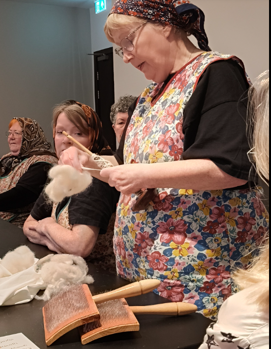 One of the Inverclyde Waulking Group showing traditional spinning on a spindle. The women would walk around with these spindles tucked into a pocket or a waistband, and in any free moments would spin yarn using the power of gravity and the spinning nature of the spindle. The spinning wheel changed all that—it tied women to the home to spin.