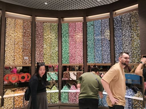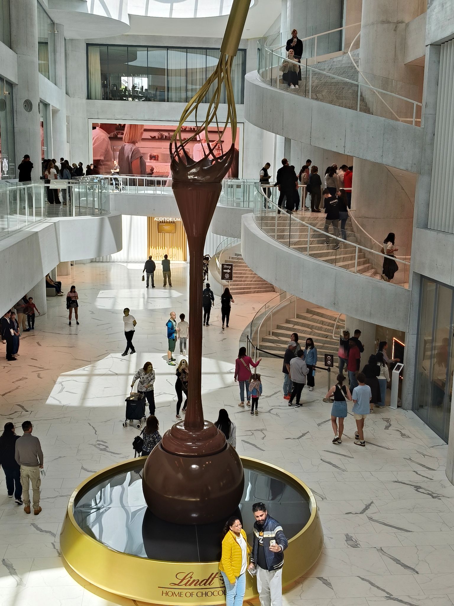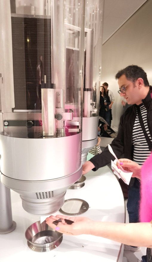 The second sampling area had more tubes, but this time there were about 16 or so of them, each with bars of different Lindt chocolates in them. There were no labels so you couldn’t tell what was in each until you sampled it. At the base of each tube they had a light ring—it glowed green when you could put your hand under, and red when you couldn’t. When you put you hand under, a piece or two of the chocolate bar would be chopped off and drop into your hand, ready for you to sample. Also yummy.