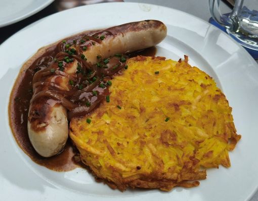 By the time we got back to town, there were a lot of people around (there’d been almost no-one earlier on—the shops etc. don’t normally open until 10am, and because it was a public holiday, not many were open at all, but the bars and restaurants were certainly coming into their own on our return). We walked some more, then decided to share a late lunch/early dinner of bratwurst, with rich onion gravy and rosti (potato dish). Very yummy! We have an early start tomorrow and figured we should probably get some sleep!