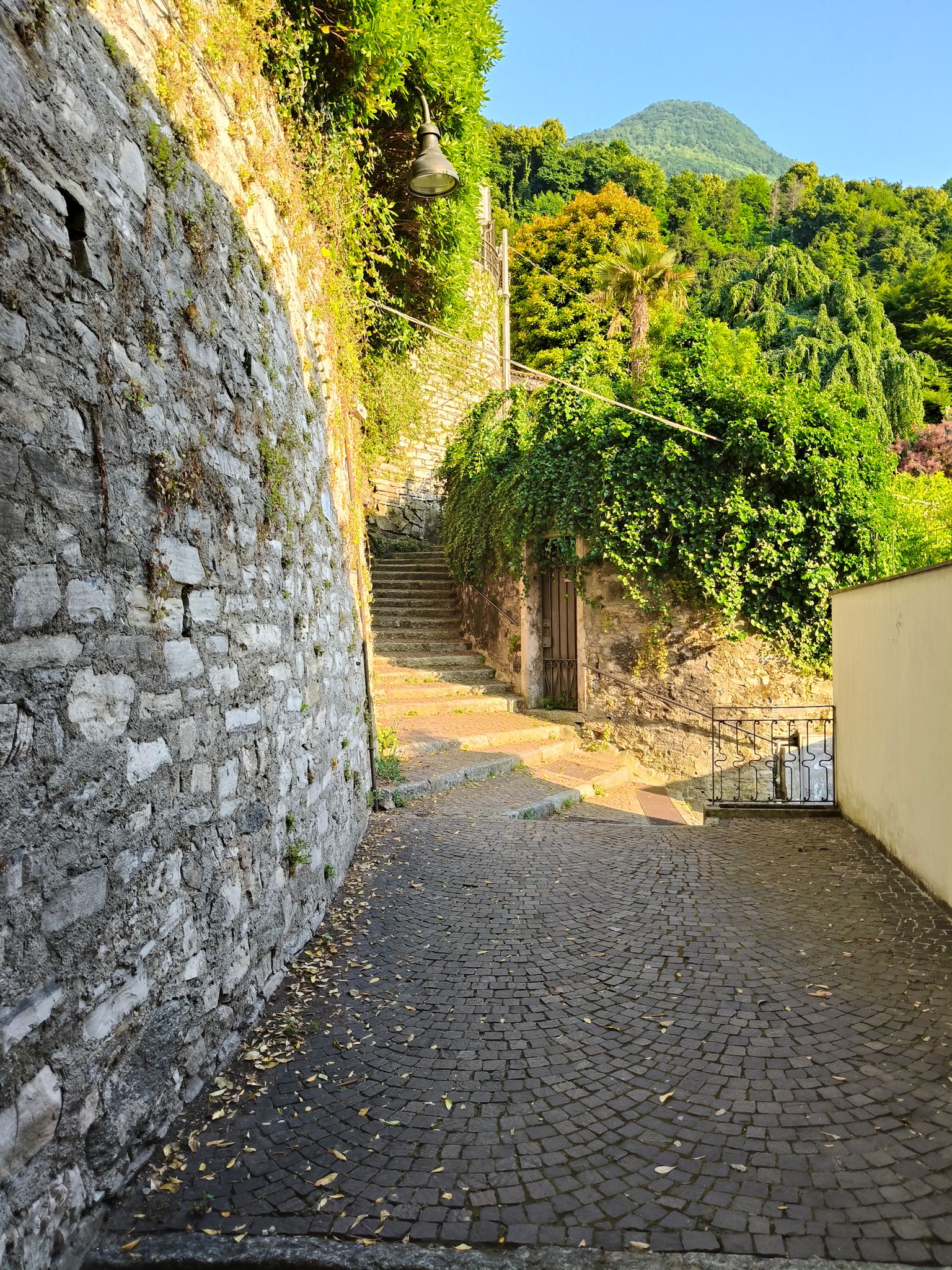 The house we’d rented was lovely but Torno is an old village perched on the edge of one of the hills surrounding Lake Como so cars can’t get near much of it. The taxi dropped us off on the main road—based on the maps and the managers’ information pack, we’d calculated it was the shortest way to the property. While it may have been, they didn’t mention how many steps were involved! We then bumped our luggage down about 400 steps before we found the house (which was 4 stories and also full of steps!! ). Most of those steps from the main road were long and sloping (and rough!) with shallow risers, so we were continually fighting against gravity, which wanted to take our wheeled luggage down all by itself. It was also HOT and my jeans were soaked with sweat from the exertion of holding back heavy luggage to prevent it from ending at the bottom in a broken pile. I was very glad I’d invested in some silicon wheel covers for my luggage wheels.