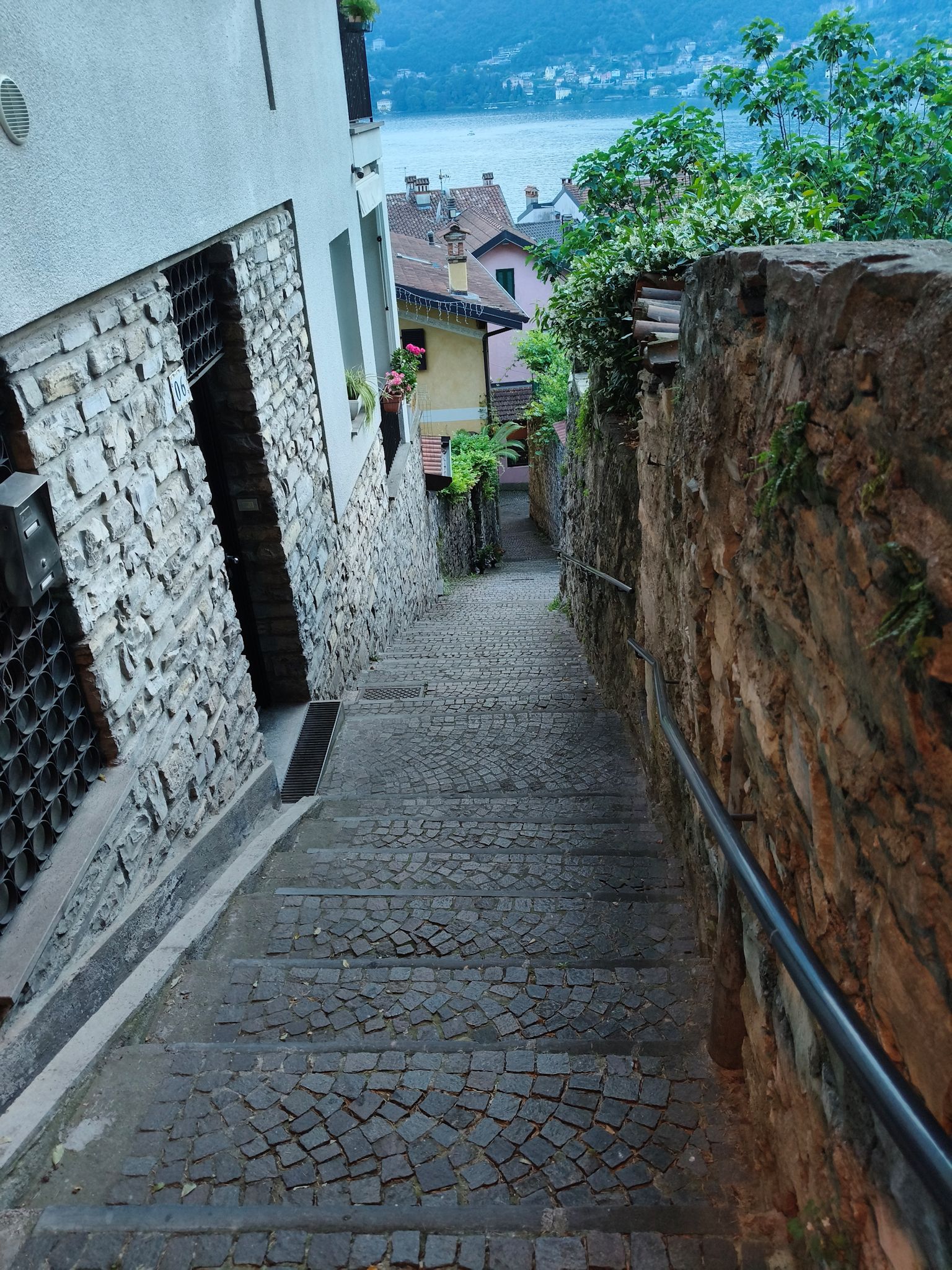 It was a nice house (we had a friend joining us the next day) but because it was an old property with high ceilings, there were 4 floors. The basement bedroom had its own bathroom (which had issues of its own), then there were 30 steps (not the usual 16 or so) to the entry level, where there was another bedroom (with a ‘bathroom’ with NO shower or bath!). Another 30 steps up to the living, dining, kitchen area, which had glimpses over Lake Como, then a further 30 steps up to the top bedroom/bathroom. The steps were all painted black, with no strip to indicate the edges, and no handrails, so they were dangerous too. It didn’t matter where you were in the house, you had a minimum of 30 black steps to negotiate to get anywhere else. Then all those steps outside… Our 5-night stay was going to involve a LOT of exercise!