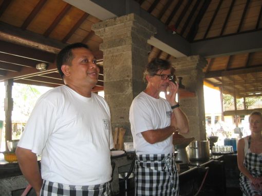 My verdict on cooking school: BRILLIANT! Well worth doing. If you’re going to Bali and are interested in food, then book a place (try and book as far ahead as possible — I heard there’s a two to three month waitlist; we were just fortunate there was a cancellation). Cost: US$90 for cooking school plus market (start at 6:00 am); US$80 for cooking school only (start at 9:00 am). If you can get up early enough, do the market part to as Heinz imparts a lot of information at the market that he doesn’t cover while cooking.
