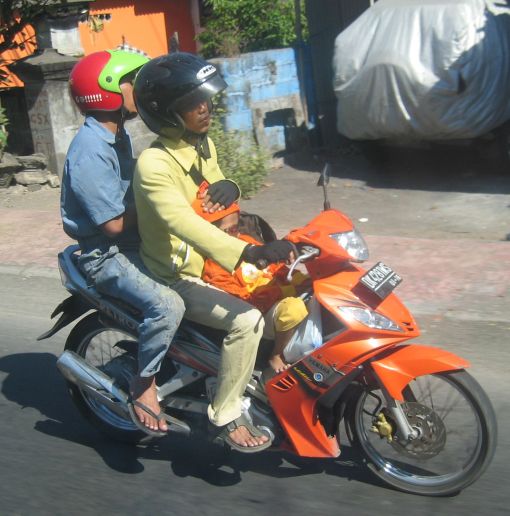 • HUGE number of motorbikes — everyone rides them. I’ve seen Muslim women in full hijab, small children riding in front of or between their parents, riders carrying sheets of glass (!) and other merchandise, women riding sidesaddle as pillion passengers. There’s lots of tooting and it all seems terribly chaotic, but there’s no evidence of road rage and little evidence of bingles between various road users. We could learn a lot!